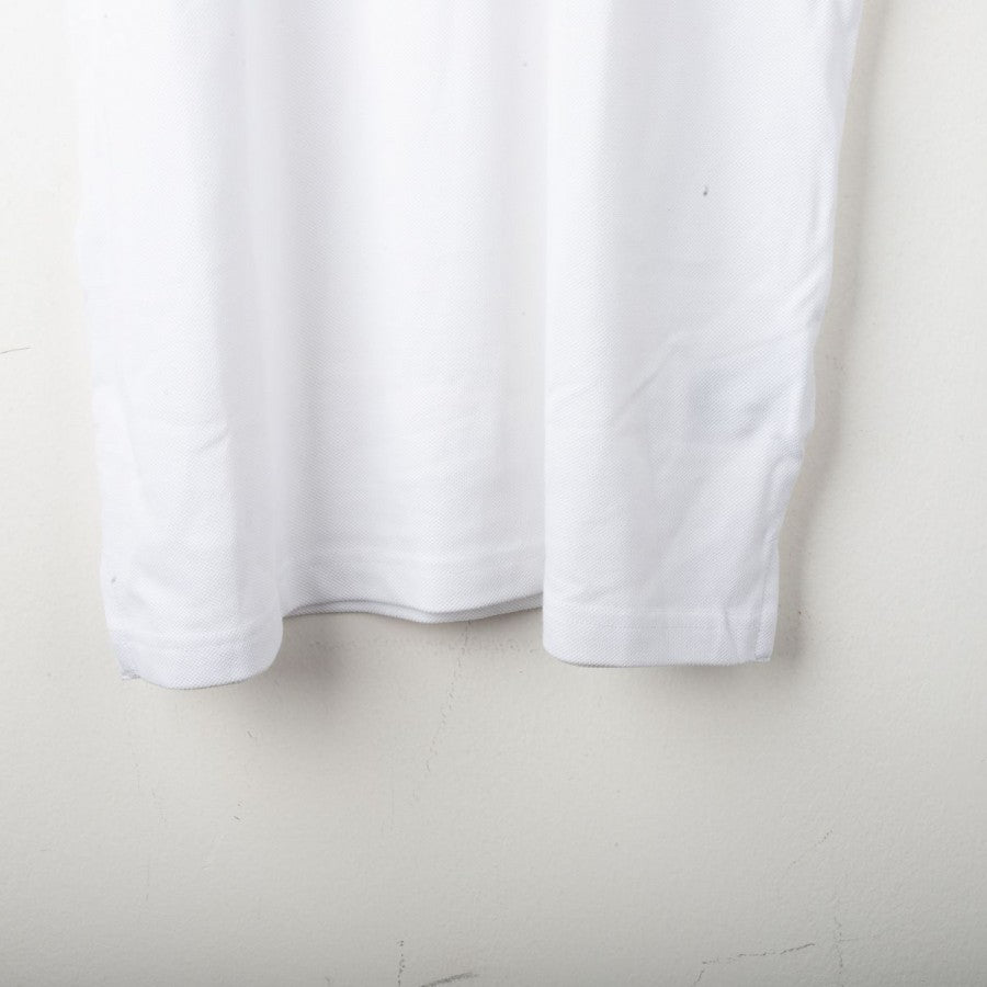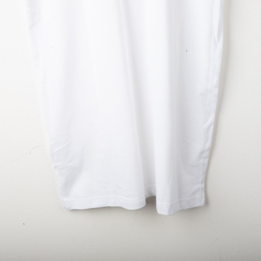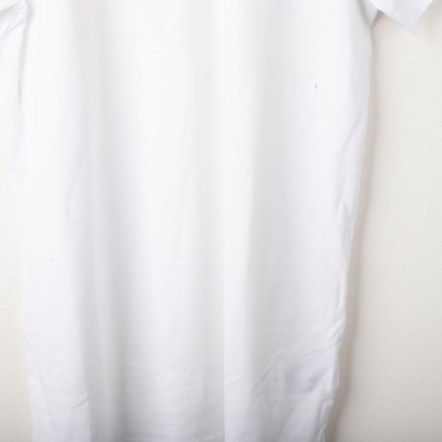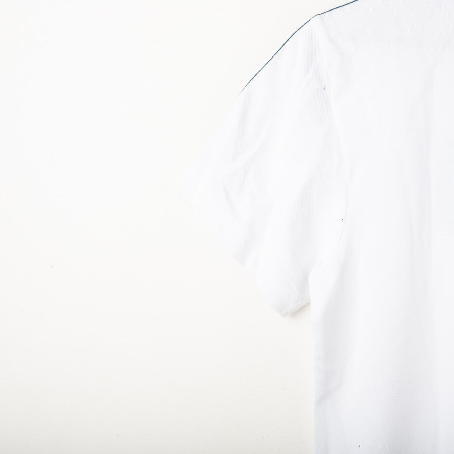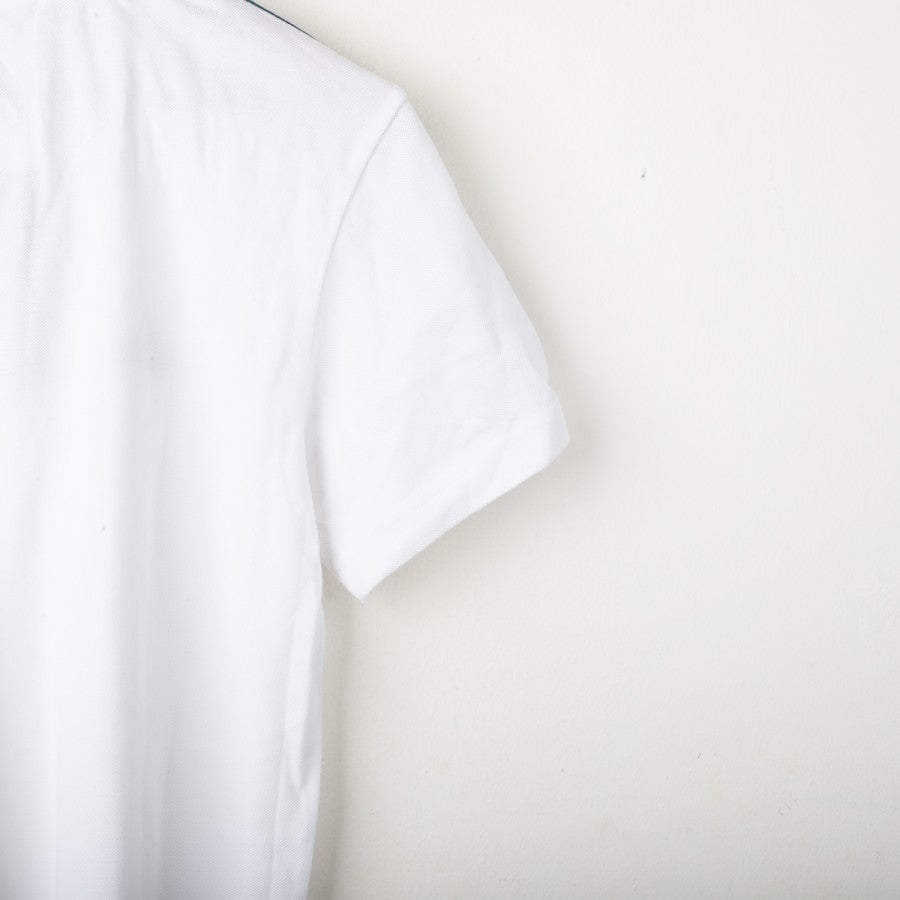 Juventus Adidas polo shirt from the 2017/2018 season. White color with petroleum blue accents. Applied Adidas logo and Juventus crest on the chest, three-stripe detailing on the shoulders, and a classic three-button polo collar. Regular fit. Size S.