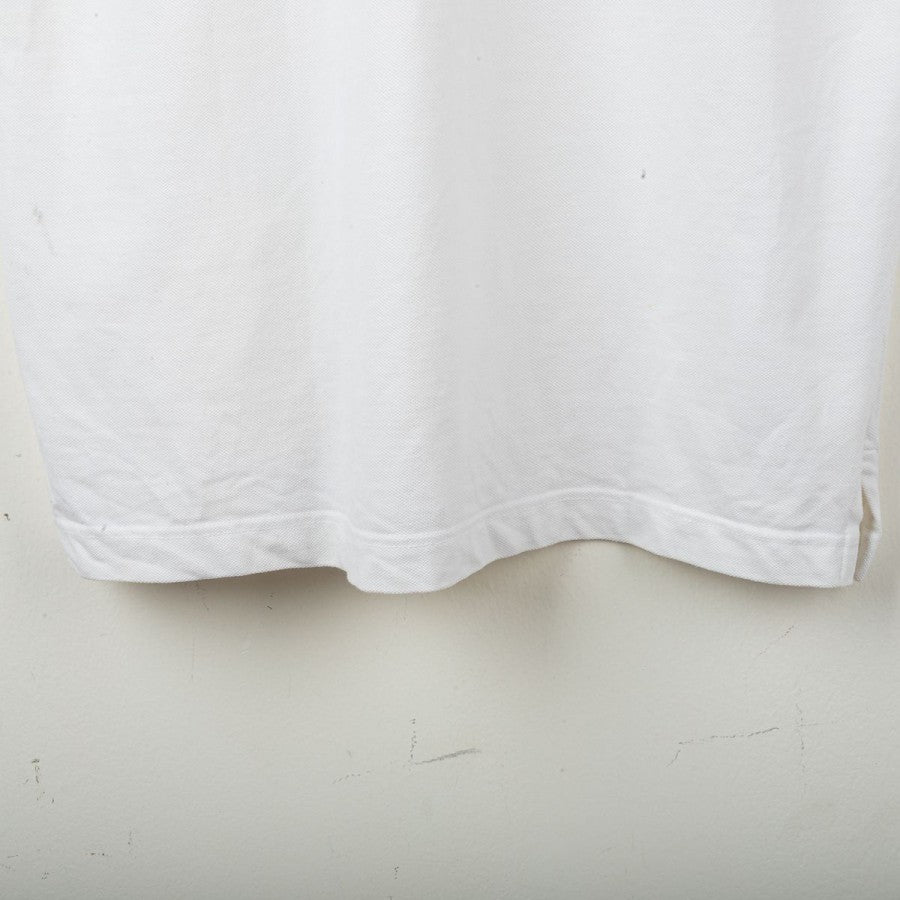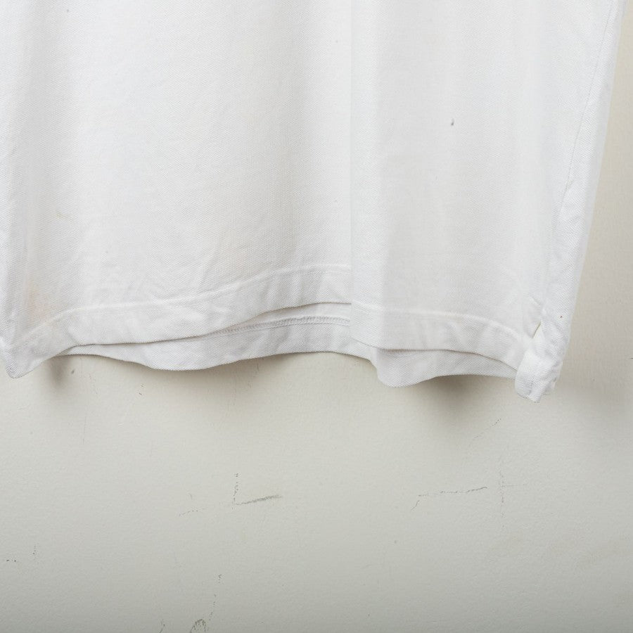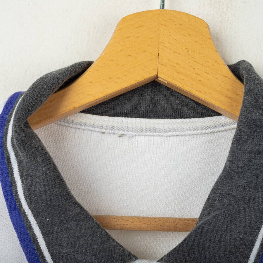 Official Juventus polo shirt from the 1992/1993 season, made by Kappa. White with contrasting grey collar and blue/white details. Stitched club crest on left chest. Embroidered Kappa logo on chest. “Danone” sponsor embroidered on stitched patch on right chest. Two-button closure. 100% cotton, Made in Italy. Size L.