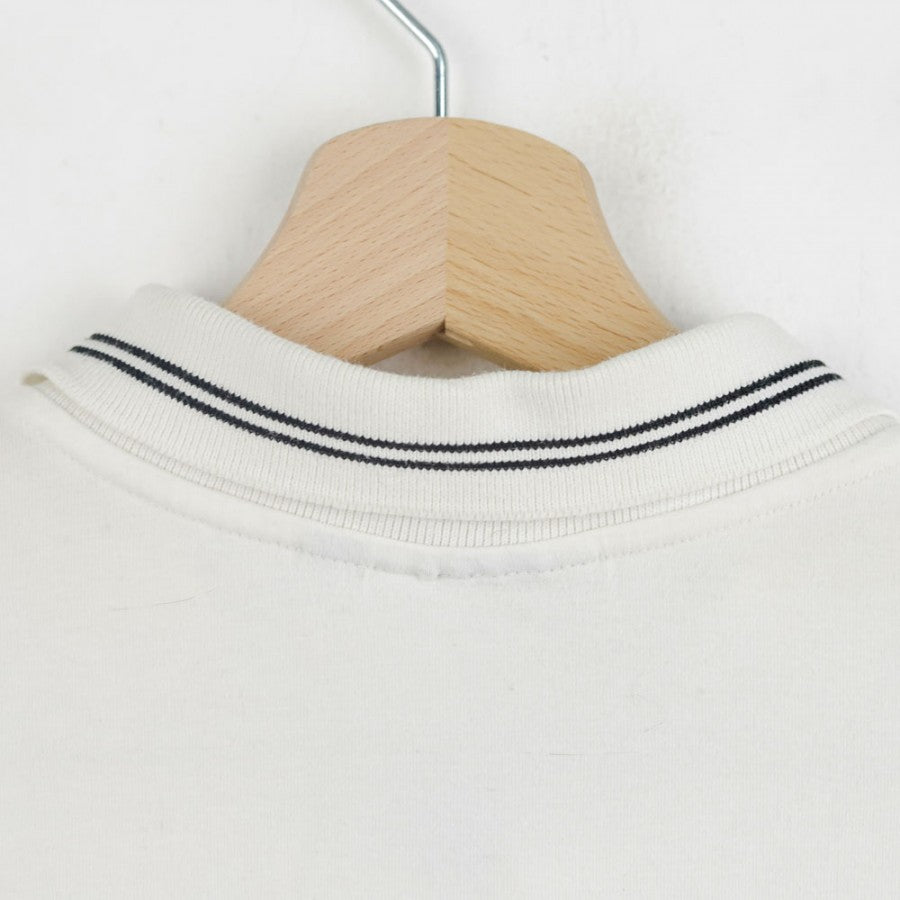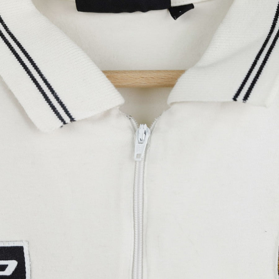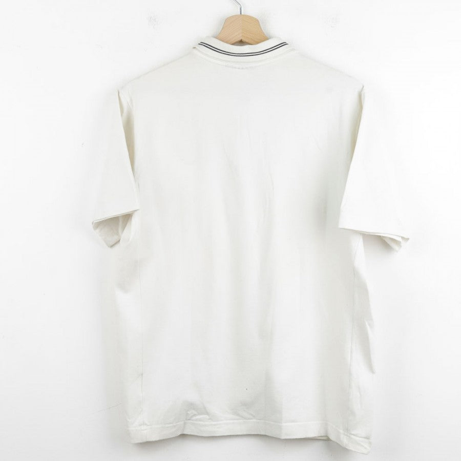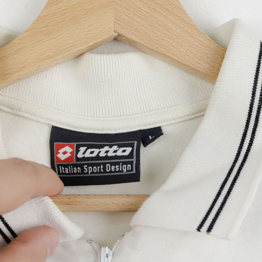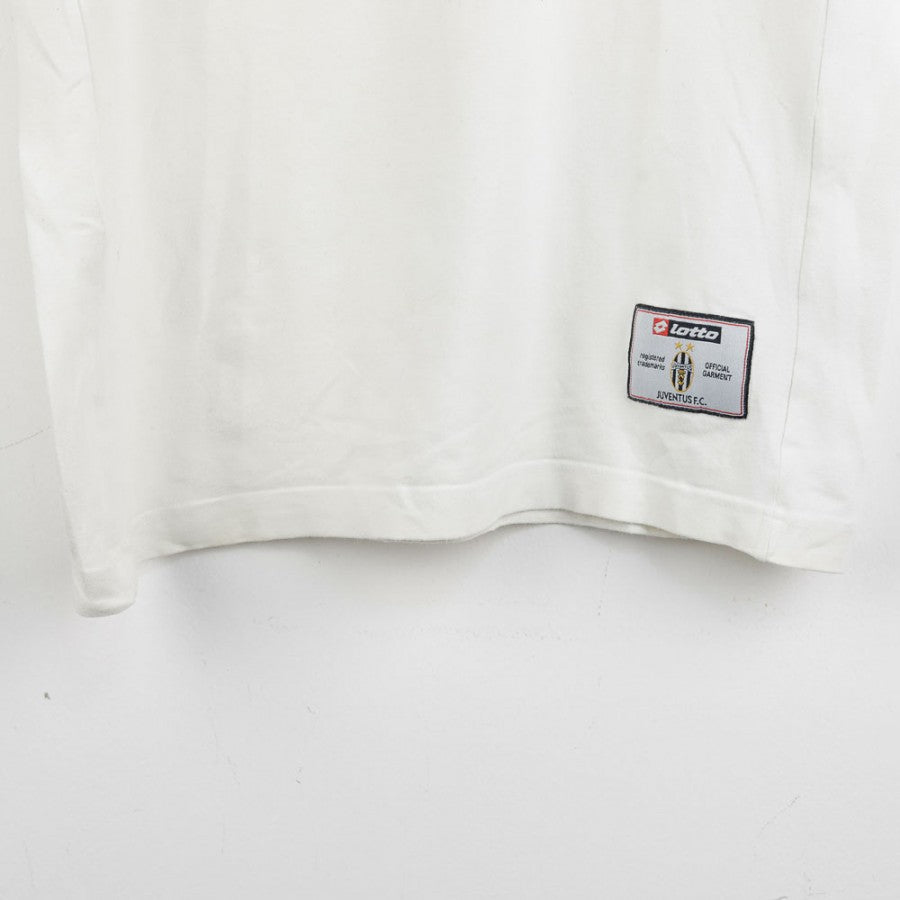 Official Juventus polo shirt from the 2001/2002 season, produced by technical sponsor Lotto and featuring commercial sponsor Fastweb. This half-zip model is white with black details on the collar. The Lotto logo, Fastweb logo, and Juventus crest with two stars are applied on the chest. Size L.