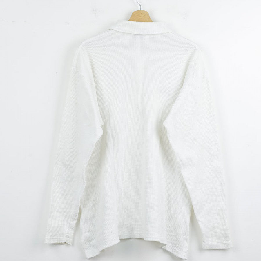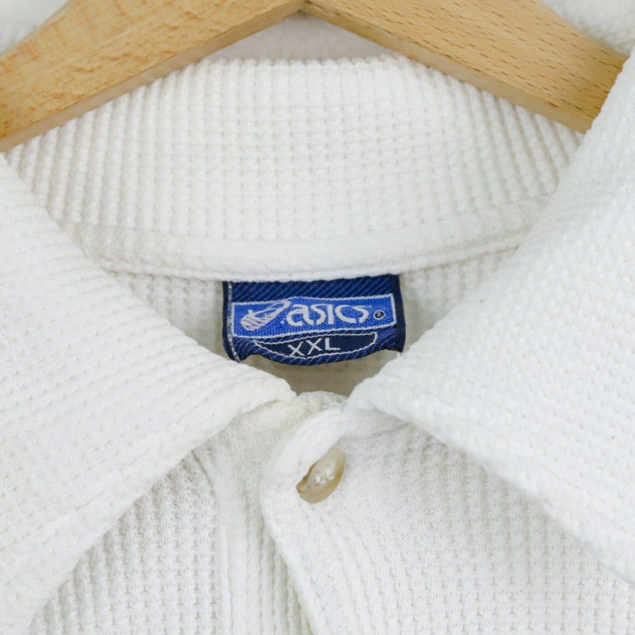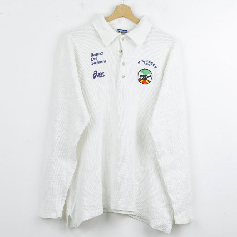 Official polo of US Lecce from the 1997/1998 season, produced by technical sponsor Asics. The shirt features a classic waffle-textured fabric in white. On the left chest, the Lecce crest with a stylized olive tree is stitched, while the right side displays the "Banca del Salento" commercial sponsor logo and the Asics logo in blue embroidery. This polo is an elegant symbol of Lecce’s football tradition, crafted with high-quality materials to commemorate an important season for the club. Size XXL.