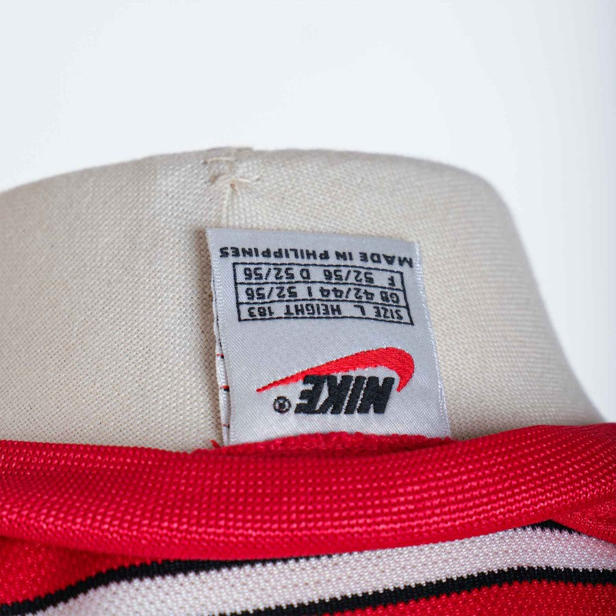 Short-sleeved training shirt of Napoli season 1997/1998 red with white horizontal bands. On the front there are the logos of Napoli, sewn, and Polenghi, embroidered, in addition to the Nike logo embroidered in white on the front and back. The Polenghi logo in white is also applied on the back.