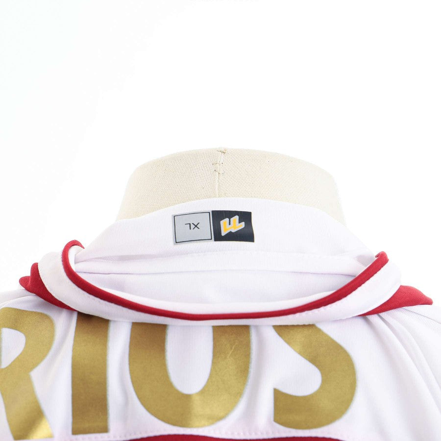 The Reggina away shirt is made by Onze for the 2007/2008 season. It is white with red details. On the front there is the emblem of the Calabria Region on the heart side, in the center immediately below the neckline the queen logo and on the right the Onze logo. At the center of the vintage shirt the lettering of the commercial sponsor GICOS. A special feature of this shirt is the white mandarin collar with red details. On the back in gold name and number RIOS 11.