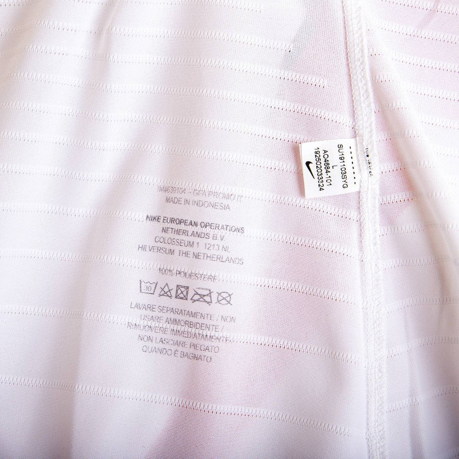 Roma midfielder Lorenzo Pellegrini's 2019/2020 season Away match shirt. The Roma logo patch is applied on the front on the heart side and the Nike logo is printed on the right side. At the center is applied the logo of commercial sponsor Qatar Airways while on the back are printed lettering PELLEGRINI and number 7, as well as the logo of the second sponsor Hyundai. On the back neck there is the Roma logo patch and on the right sleeve there is the Serie A Tim patch. Also present is the "Engineered" authenticity label. Present inside is the heat-sealed production label.