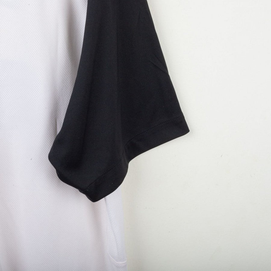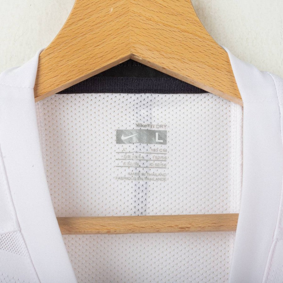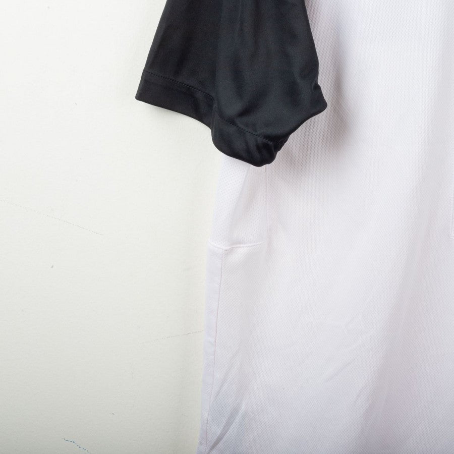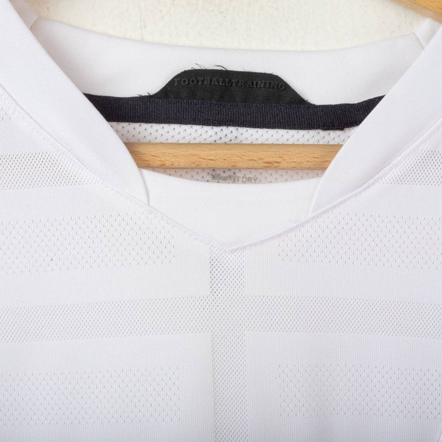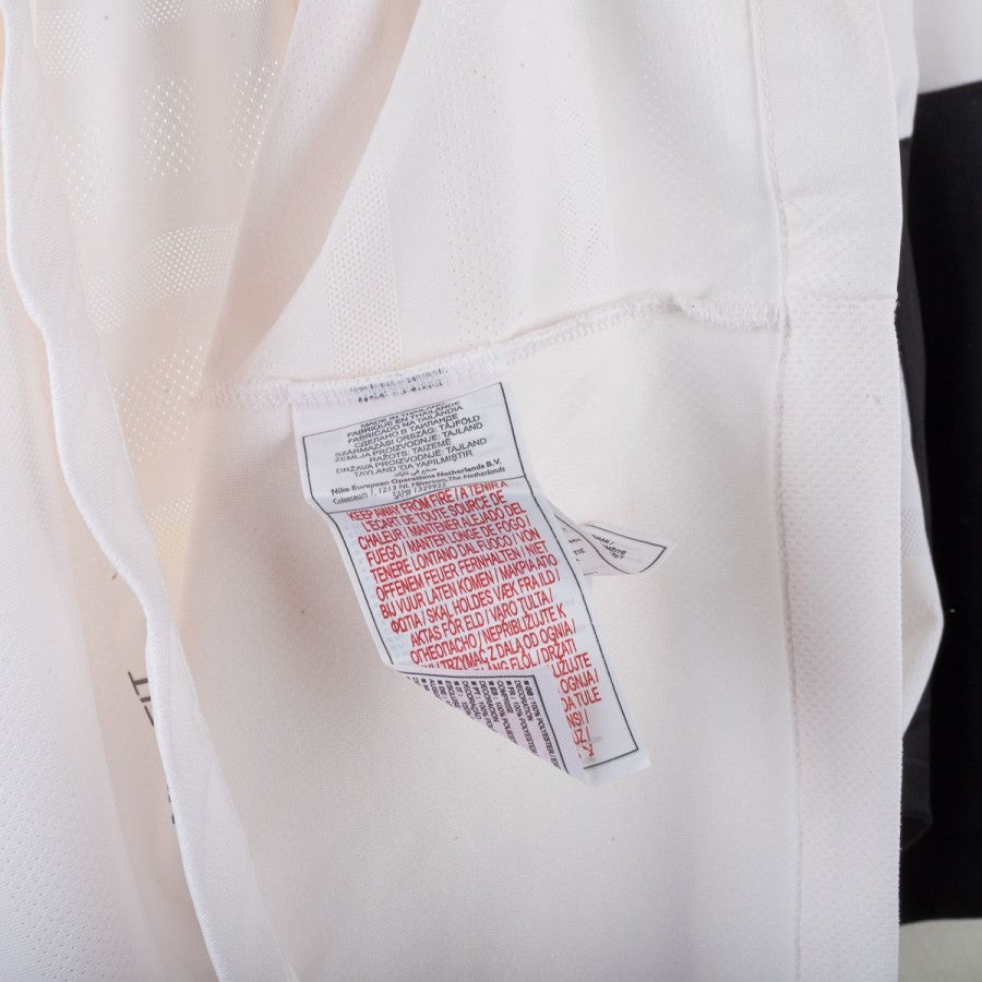 Juventus training shirt made by Nike for the 2009/2010 season. White design with black sleeves and tonal body details. "New Holland Fiat Group" sponsor printed in the centre, applied Nike logo and embroidered Juventus crest on the left chest. Nike patch with stylized logo on the sleeves. Made from NikeFit Dry technical fabric for breathability and comfort. Size L.