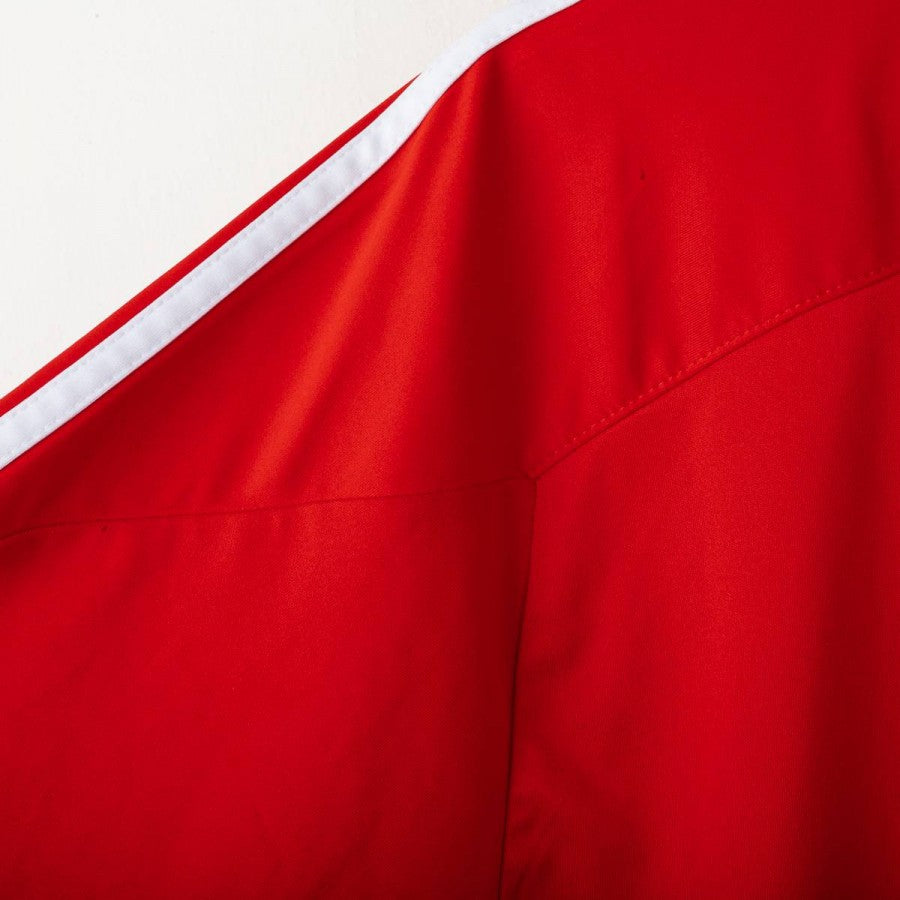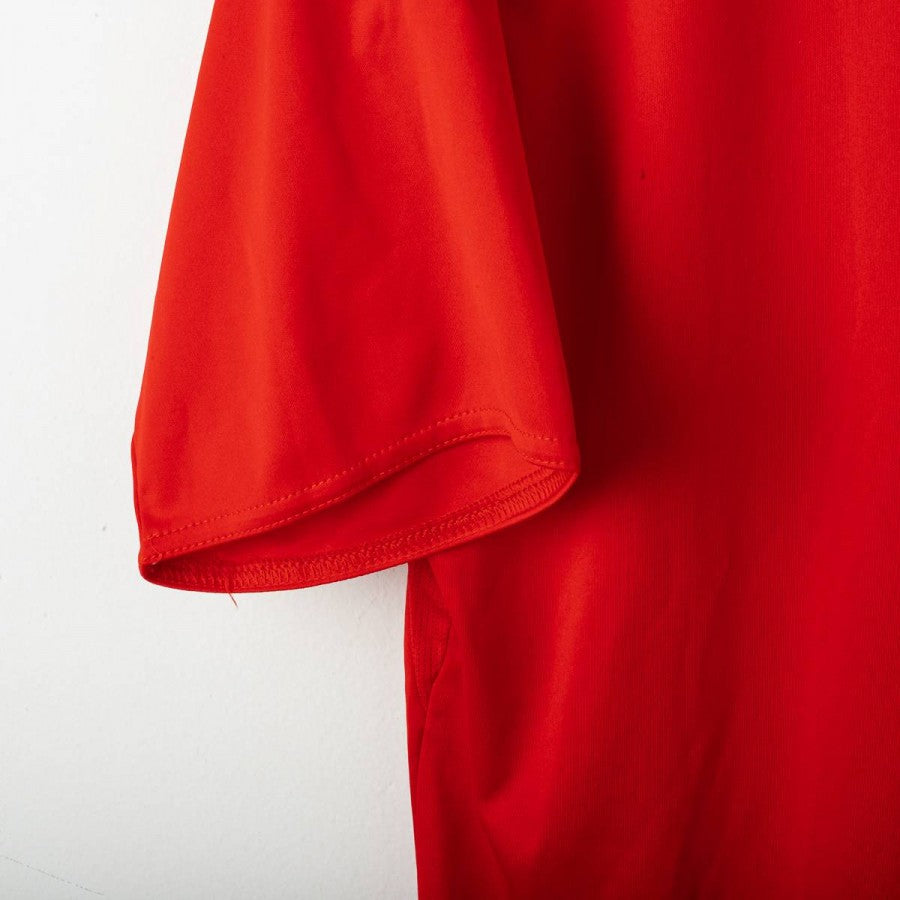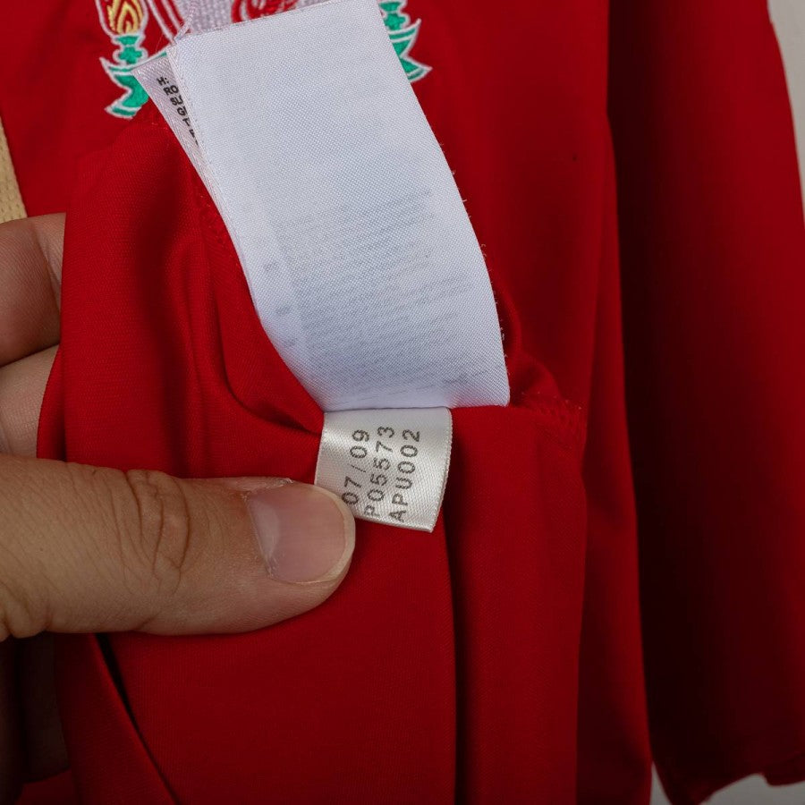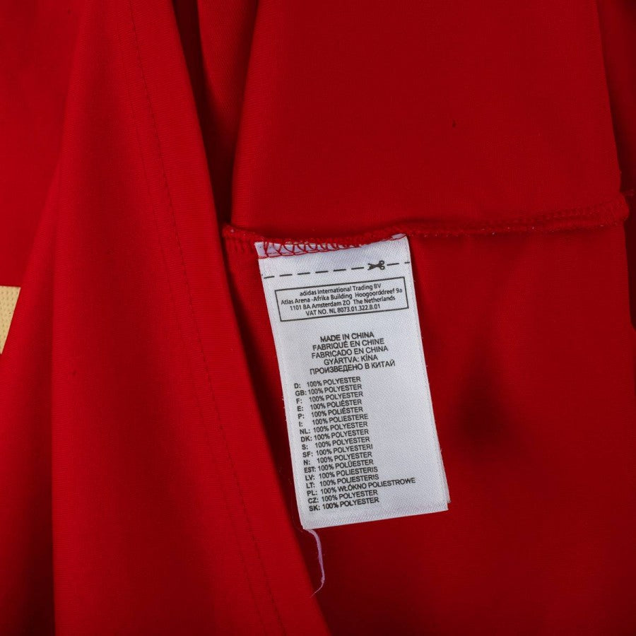 Liverpool training shirt for the 2009/2010 UEFA Champions League, made by Adidas. Red with gold and white details. Adidas logo and Champions League text stitched on the chest. Liverpool crest embroidered. Classic Adidas 3-stripes on shoulders. Made of Clima365 polyester fabric. Size L. Made in China.