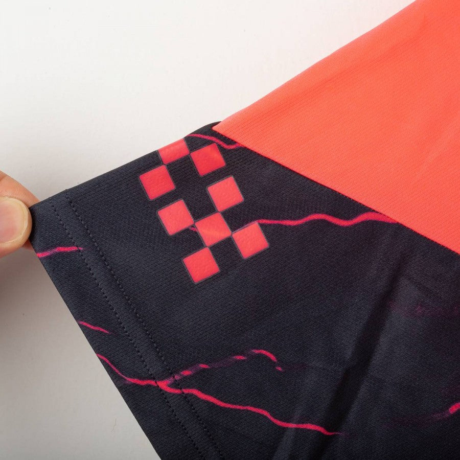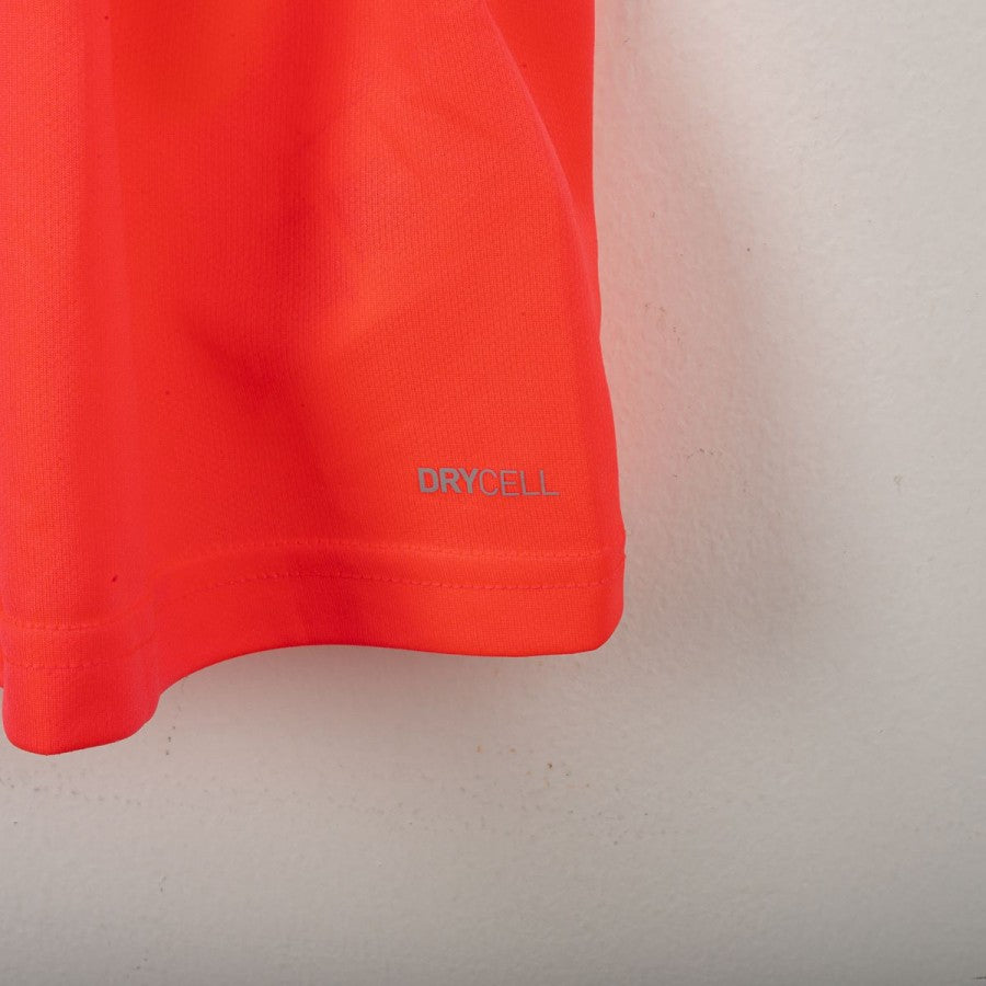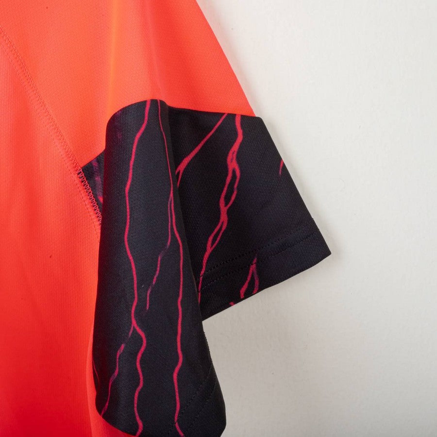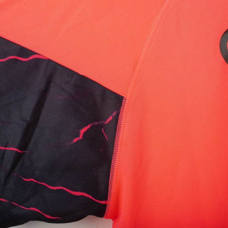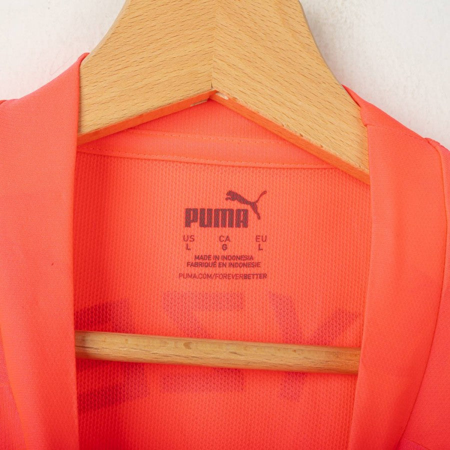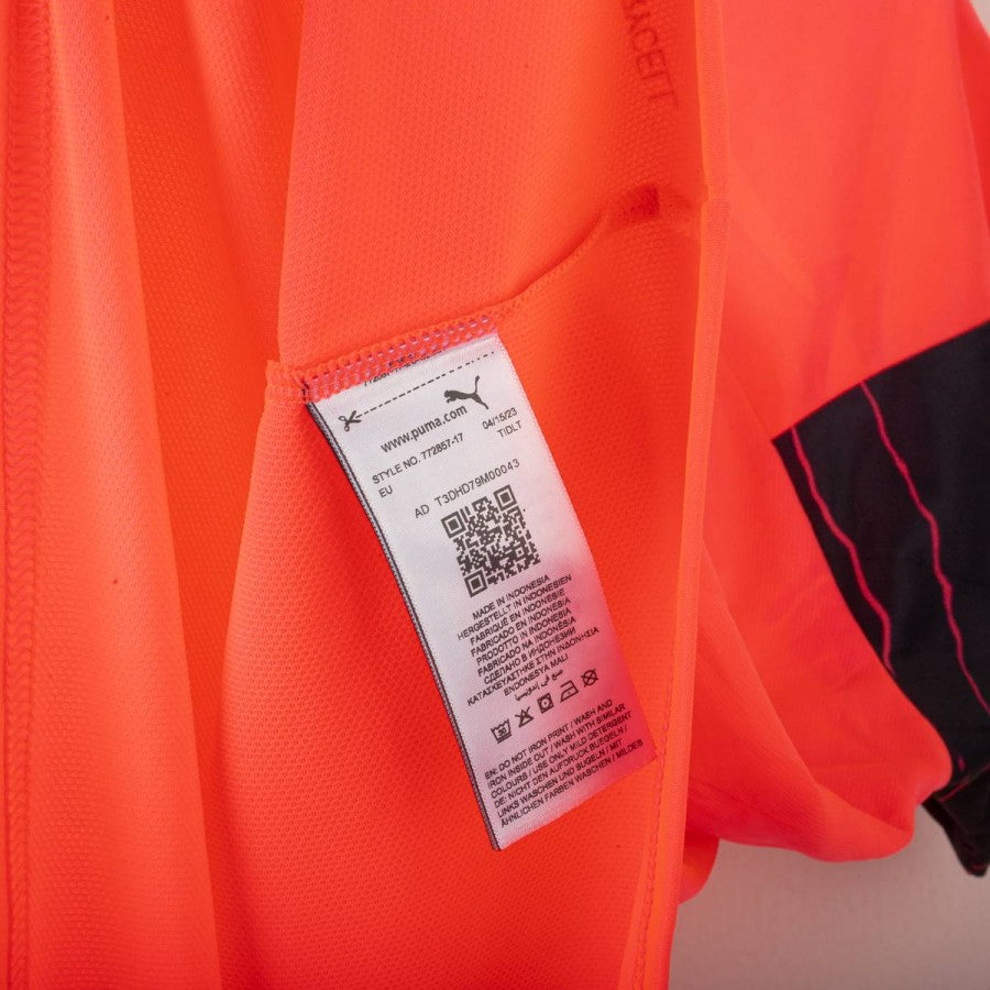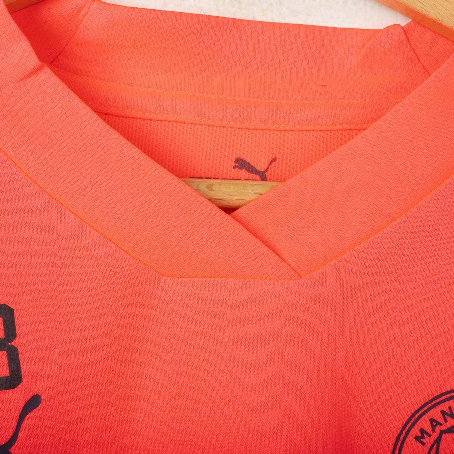 2023/2024 Manchester City training t-shirt by Puma featuring number 33. This vivid orange shirt includes bold black graphic sleeves and showcases the Puma logo along with Asahi 0.0% sponsor on the front. “CITYZENS” is printed on the back. Size L.