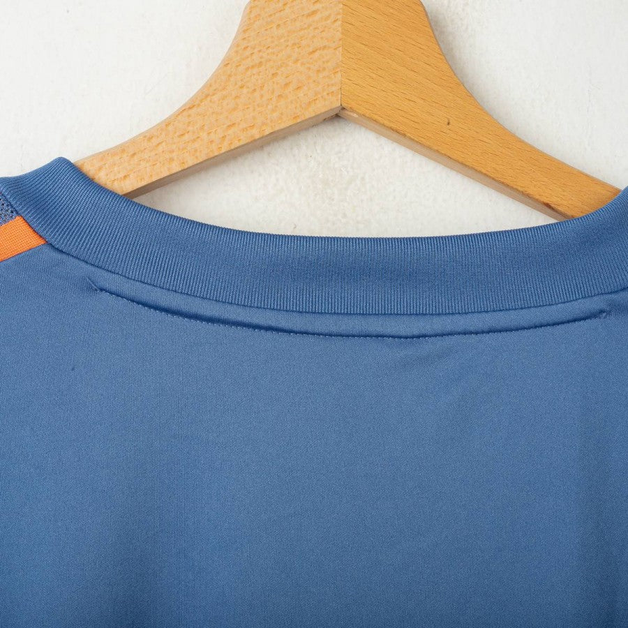 Manchester United training t-shirt from the 2022/2023 season, made by Adidas. It features a light blue design with vibrant orange details, including the club crest and Adidas logo. Darker side panels and a V-neck collar enhance the sporty look. Size XL