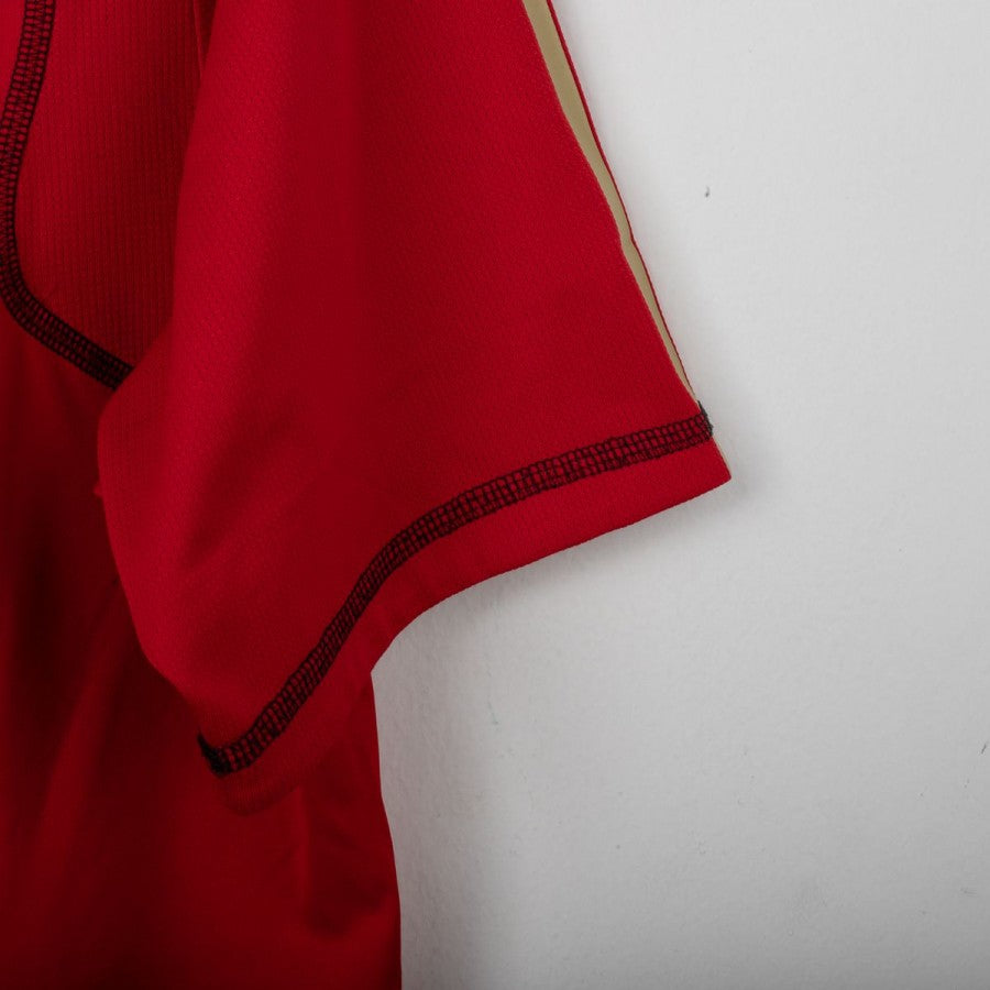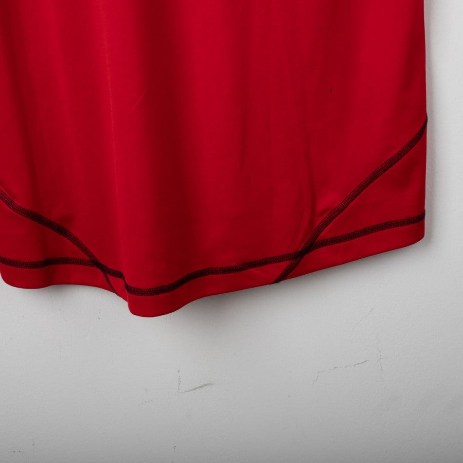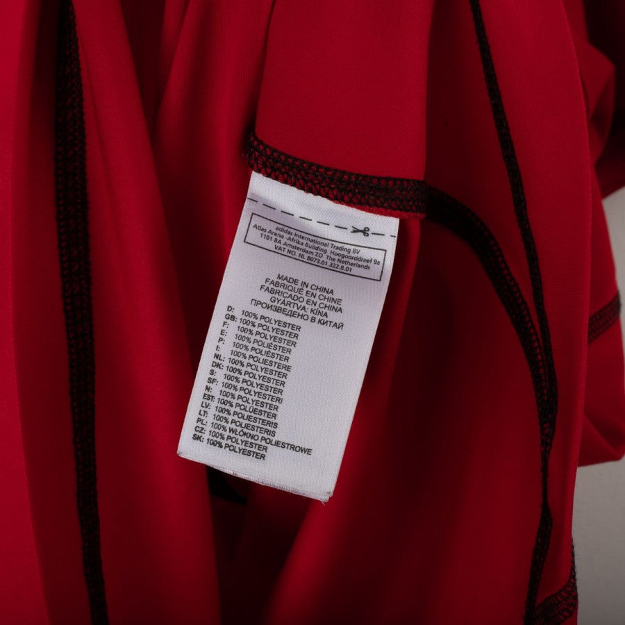 Official AC Milan training shirt from the 2010/2011 season, made by Adidas. Crafted in ClimaCool technical fabric, this red shirt features black details and gold Adidas stripes on the shoulders. The front shows the embroidered Milan badge, Adidas logo, and Fly Emirates sponsor in gold. The back mirrors the sponsor graphics in larger format. Size 7 (equivalent to XL), in excellent condition.
