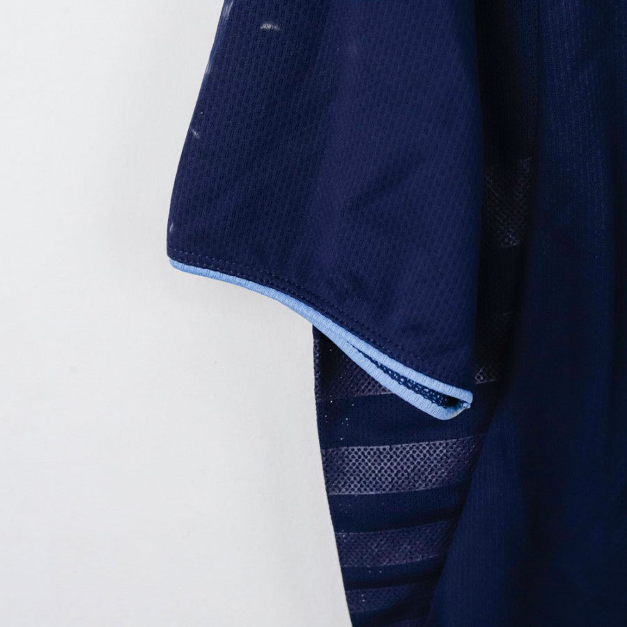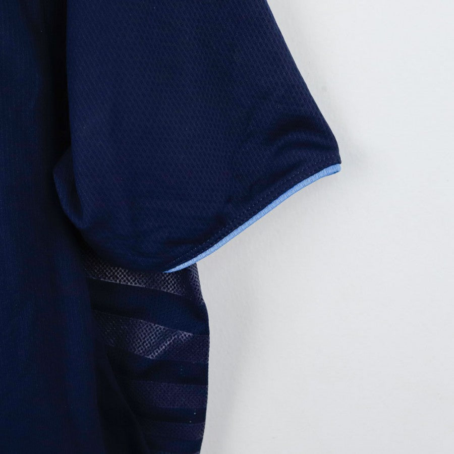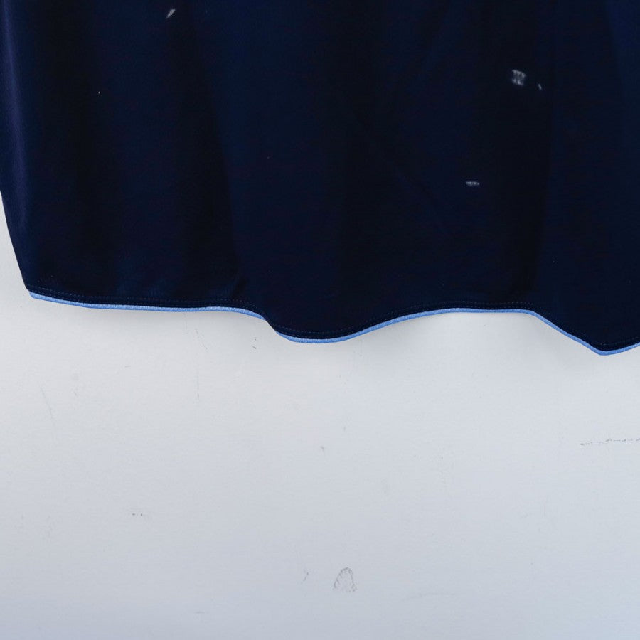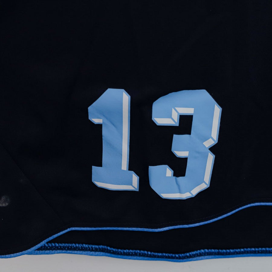 SSC Napoli Macron training shirt n13 from the 2013/2014 UEFA season. Official navy blue model with sky blue details, embroidered Macron logo and applied SSC Napoli crest. Features SSC Napoli lettering on the back and number 13 printed on the front. Made of lightweight breathable fabric, perfect for training sessions and vintage football collections.