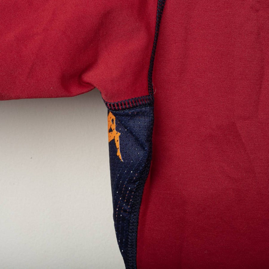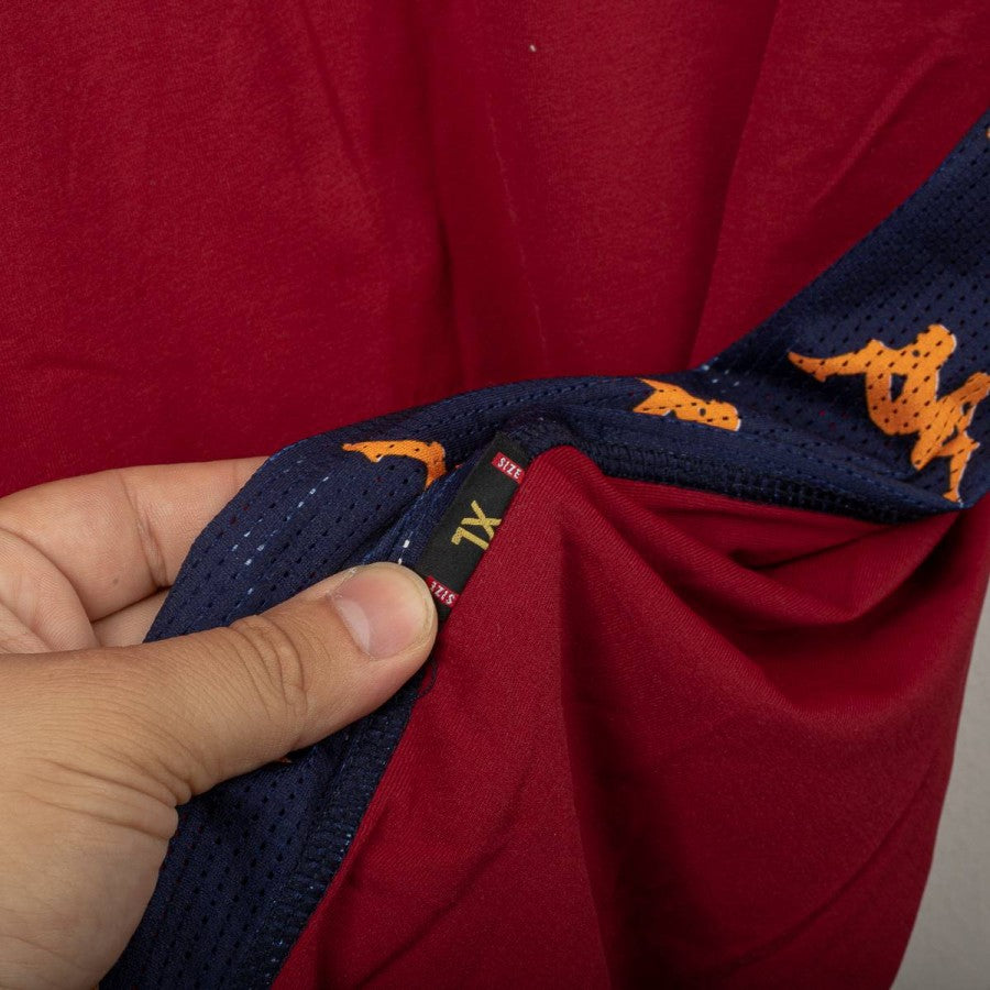 Official AS Roma training shirt from the 2001/2002 season, produced by technical sponsor Kappa. This long-sleeved shirt is made from technical red fabric with navy blue side inserts featuring repeated yellow Kappa logos. It includes a reinforced V-neck collar, the Kappa logo and INA Assitalia sponsor on the front, and large Kappa and AS Roma lettering on the back. Size: XL, as shown on the inner label.