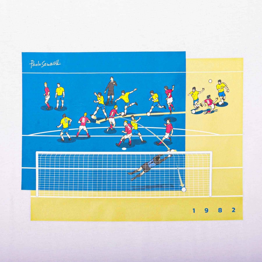 Cotton T-shirt with back collar, Seven Sisters and EMERGENCY patches and heat applied illustration depicting Socrates' 1982 World Cup goal in Spain scored against the Soviet Union.