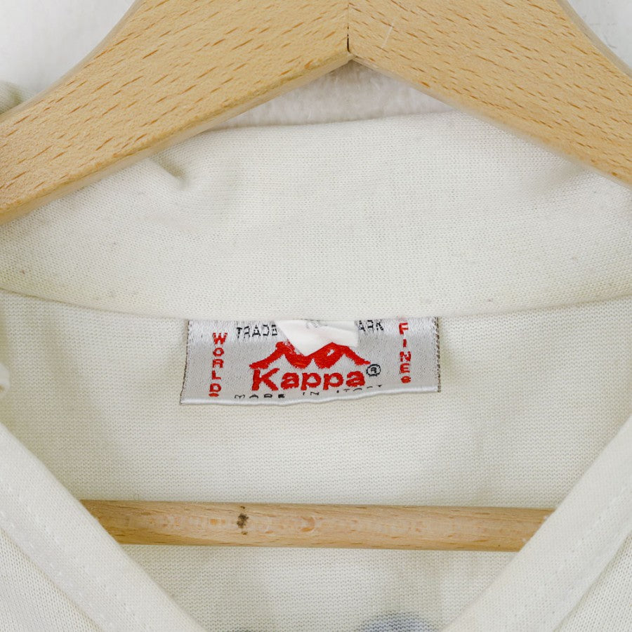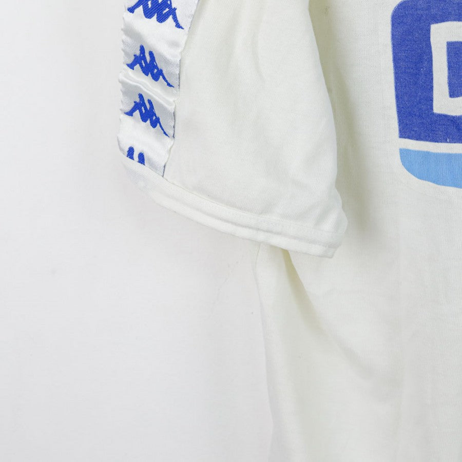 Official Juventus T-shirt for the 1992/1993 season, produced by technical sponsor Kappa. Designed in white, the shirt features the Kappa logo repeated along the sleeves and the large commercial sponsor Danone printed on the front and back. The iconic Juventus crest, with its black-and-white stripes and zebra, is applied on the left chest. The T-shirt is size XL, making it a perfect addition for collectors and fans seeking a historical piece from this era.