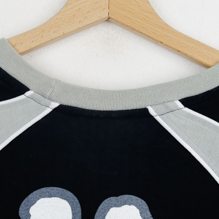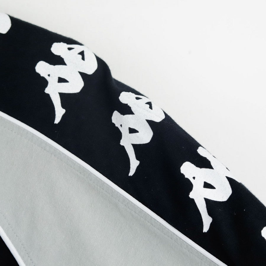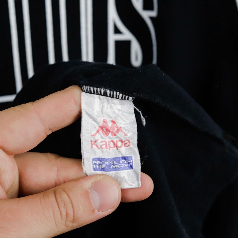 Official Juventus casual t-shirt made by Kappa for the 1995/1996 season. Black with grey inserts, oversized Kappa logo on the back, Juventus writing and Kappa logo on the chest. Size XXL.