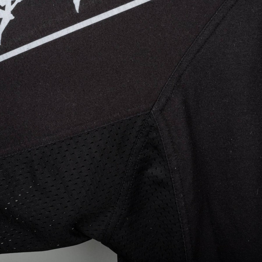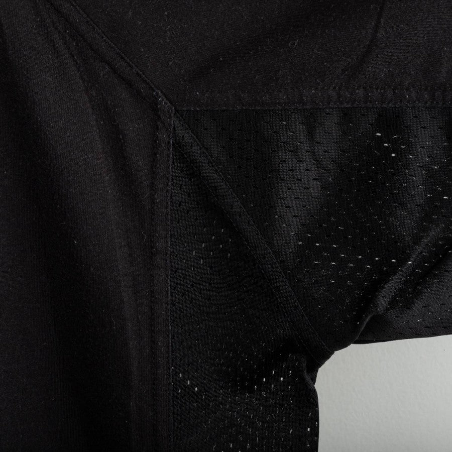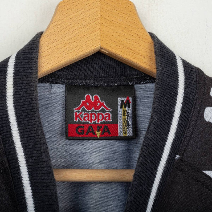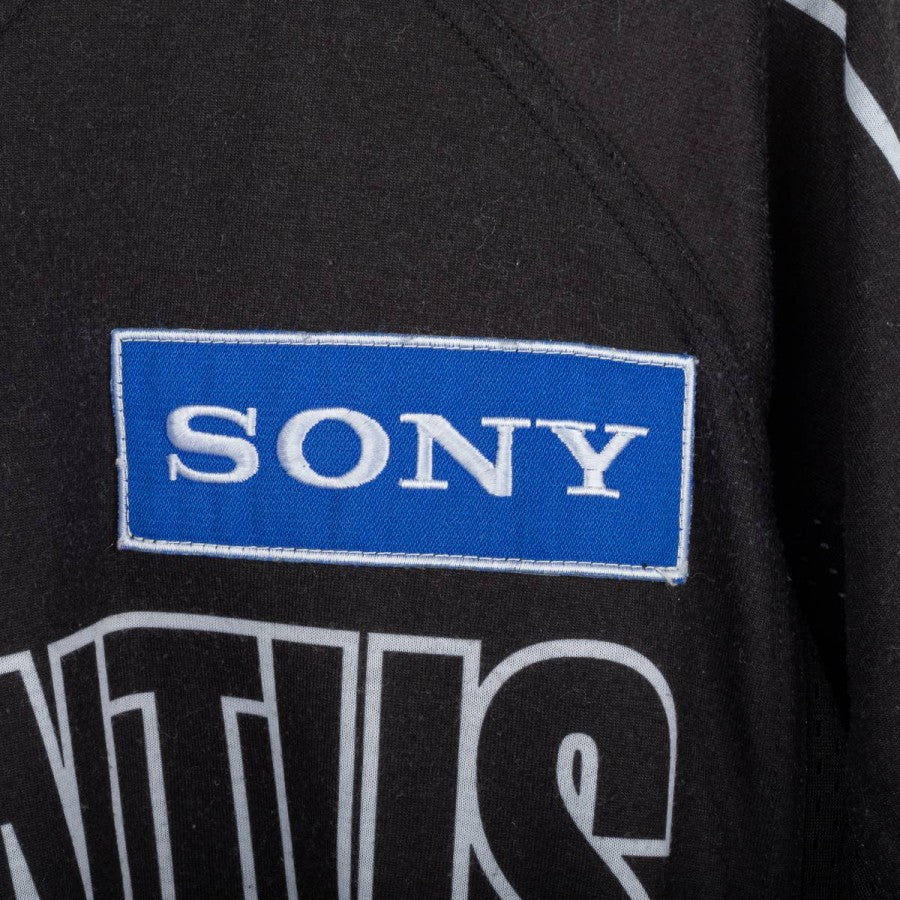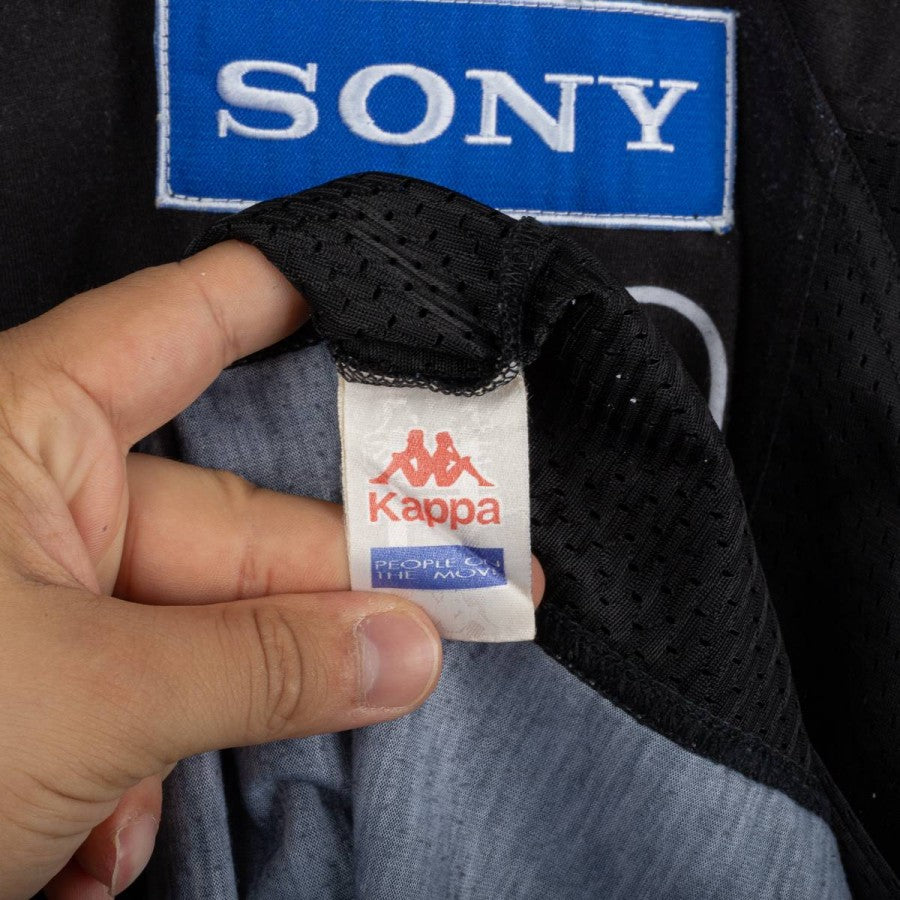 Juventus T-shirt from the 1995/1996 season made by Kappa. Black with mesh side inserts. Embroidered Kappa logo on the right chest, Sony sponsor patch stitched on the left chest, and large “JUVENTUS” print across the front. Sleeves with repeated Kappa taping in white. V-neck collar with white trim. Regular fit. Size M. Official Kappa product, Juventus technical supplier.