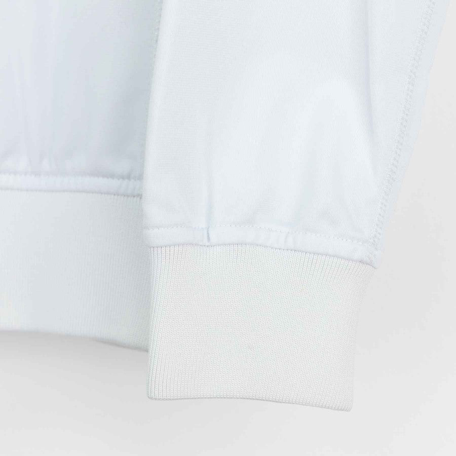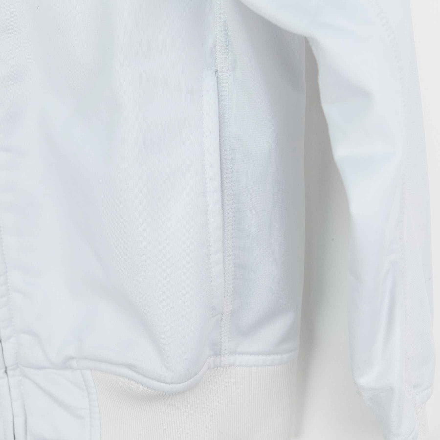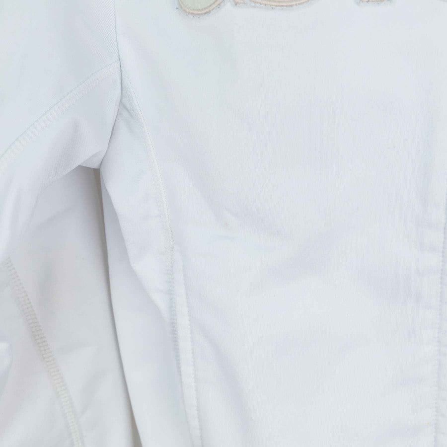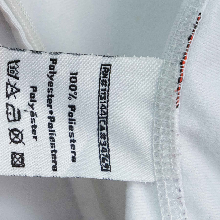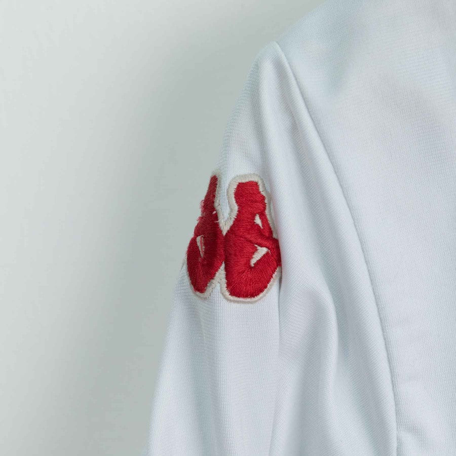 Official AS Roma kids' tracksuit from the 2010/2011 season, produced by technical sponsor Kappa. The jacket is white with yellow-red details, including a yellow collar and a tone-on-tone "as roma" embroidery on the chest. The sleeves feature the team crest and the iconic Lupetto. The red pants are adorned with the team's crest. This YL-size tracksuit is perfect for young fans who want to wear the Giallorossi colors.