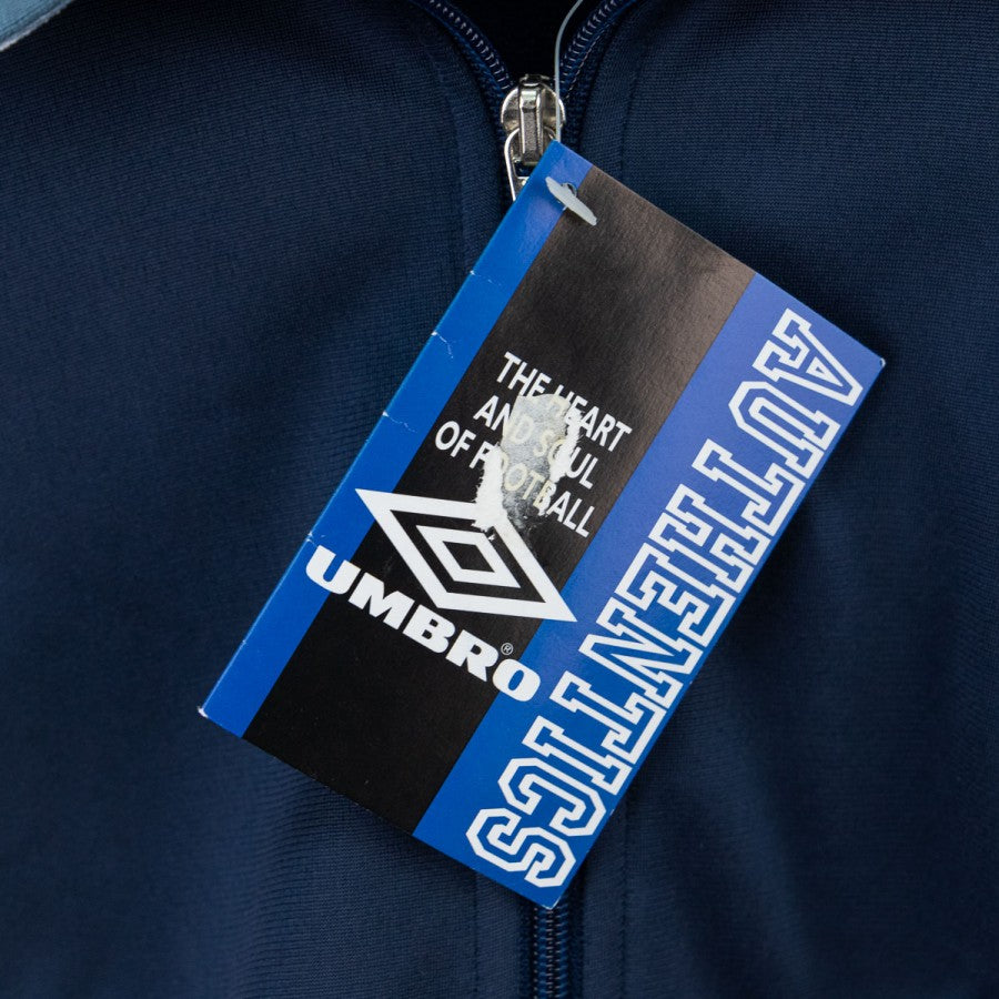 Official tracksuit jacket of the England national team from the 1988–1990 period, made by technical sponsor Umbro. The design features a bold late-'80s style with a navy blue base and diagonal inserts in light grey, teal, and white, highlighted by thin red piping. The Umbro logo is embroidered in white on the right chest, while the iconic Three Lions crest with "England" text is placed on the left. Full-zip front, high collar, and elastic cuffs. Size XL, as marked on the blue Umbro inner label.