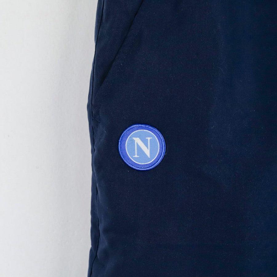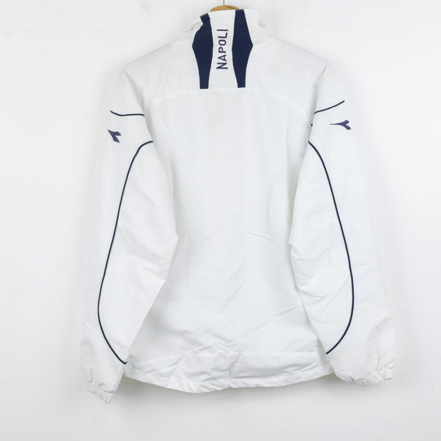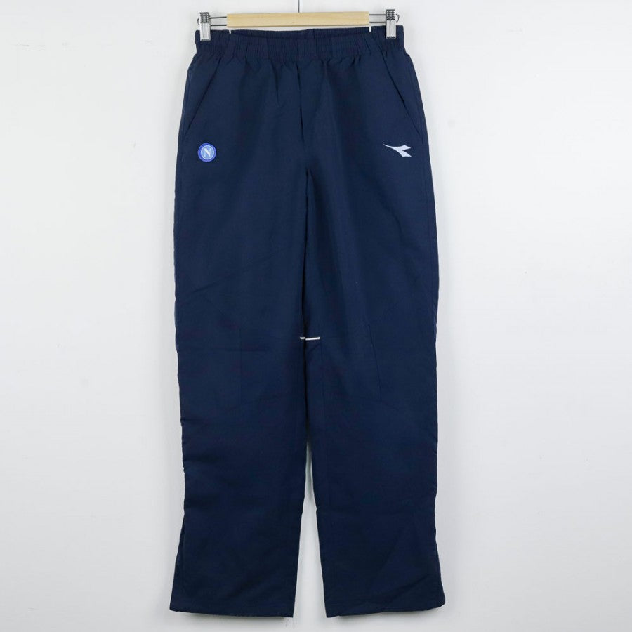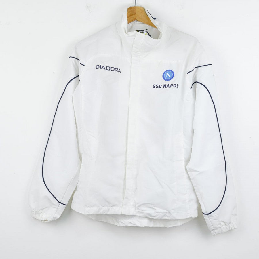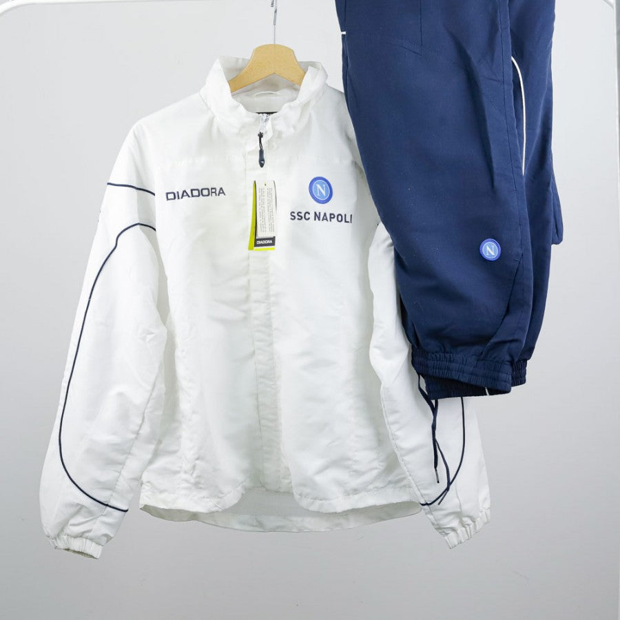 Official SSC Napoli tracksuit for the 2007/2008 season, manufactured by technical sponsor Diadora. The jacket is white with blue details, featuring the Diadora logo on the right chest and the "SSC Napoli" lettering with the team logo on the left side. The pants, in dark blue, are decorated with a small SSC Napoli emblem on the leg. This tracksuit, in size S, symbolizes an important era for Napoli, recently promoted back to Serie A and aiming for stability in Italy’s top division.