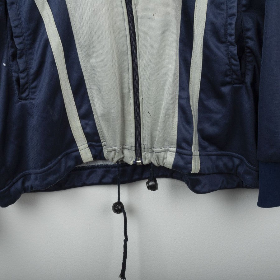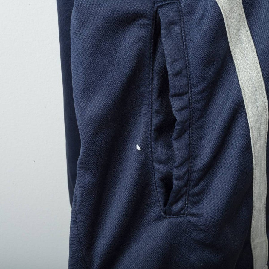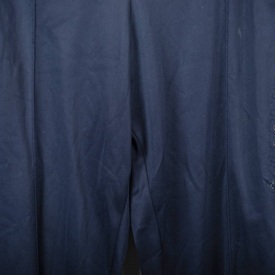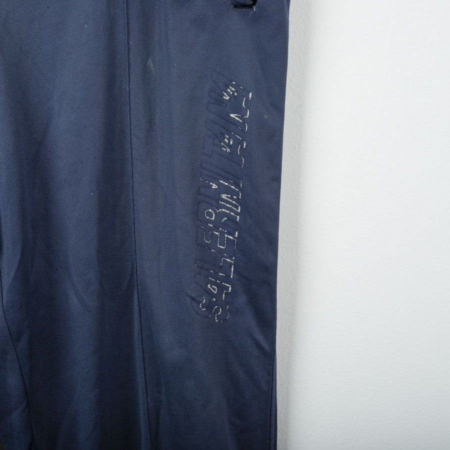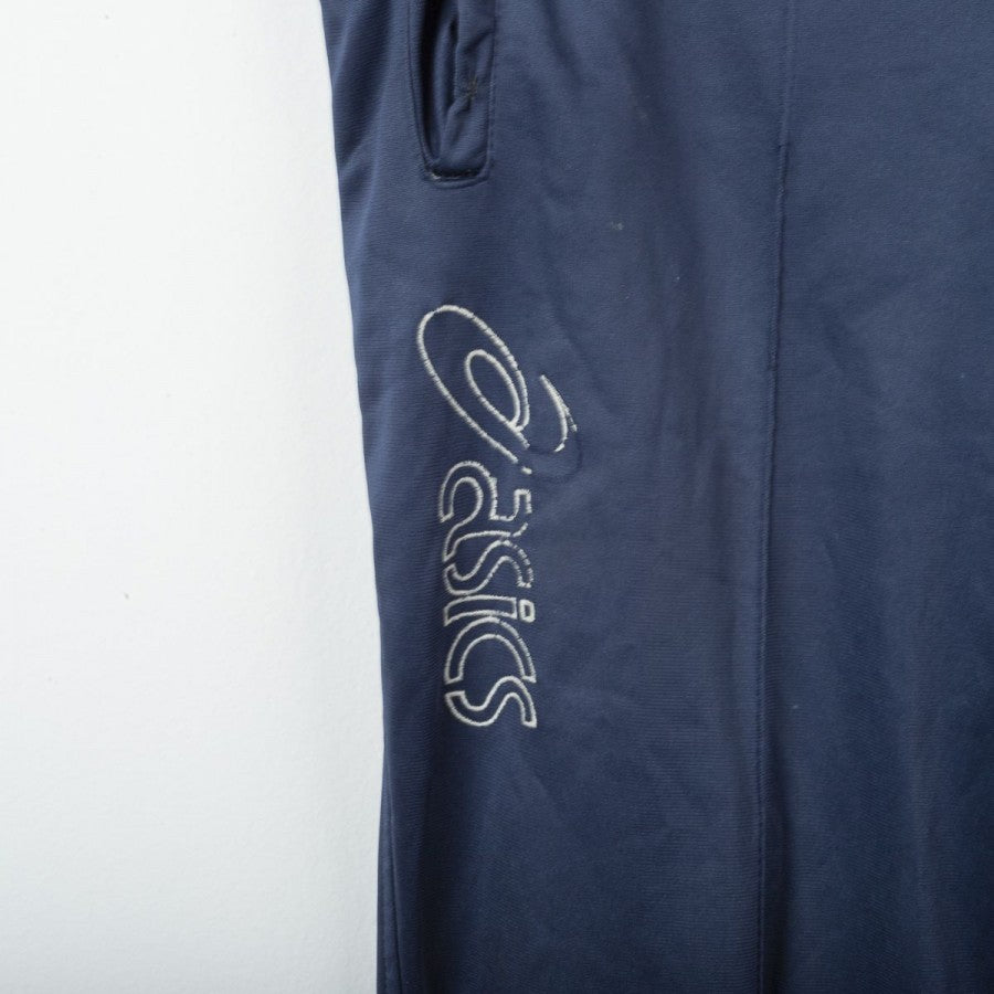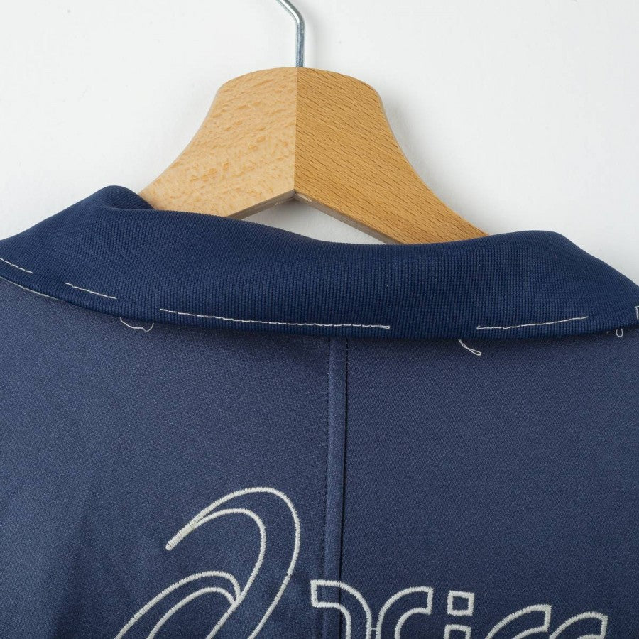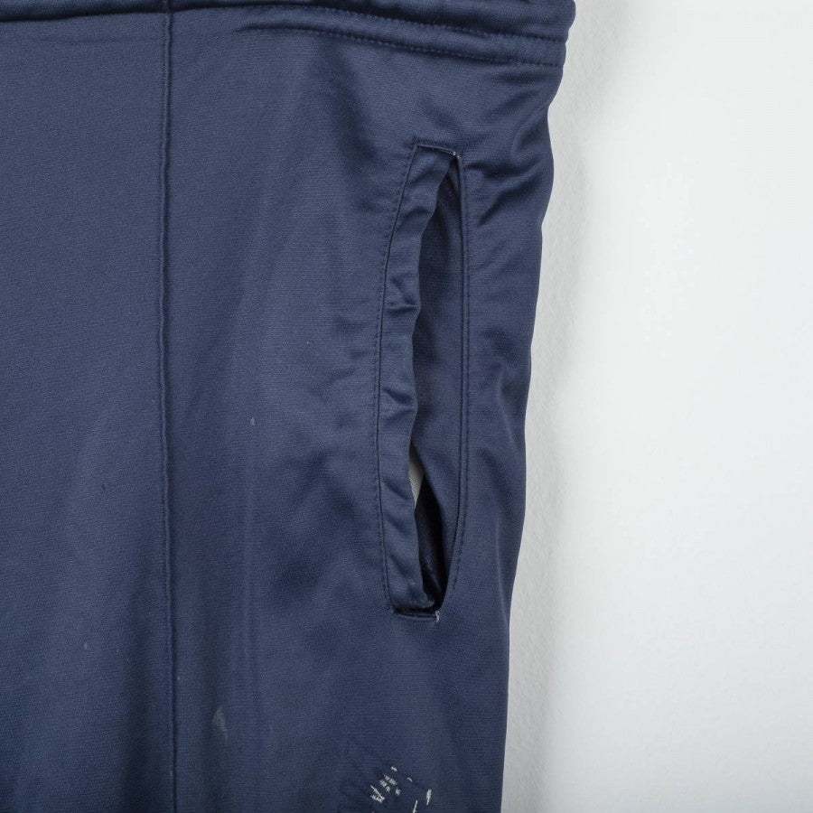 Asics Salernitana tracksuit from the 1997/1998 season. Navy blue and grey model with white details. Full-zip jacket with side pockets and adjustable drawstring waist. Embroidered U.S. Salernitana 1919 crest on the chest and Asics logo on the right side. Asics logos also featured on the sleeve and back. Matching navy blue trousers with embroidered Asics logo on the leg. Medium Size.