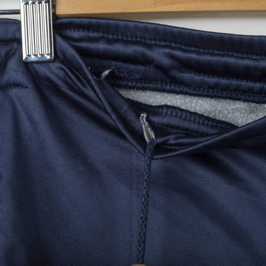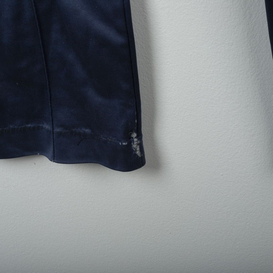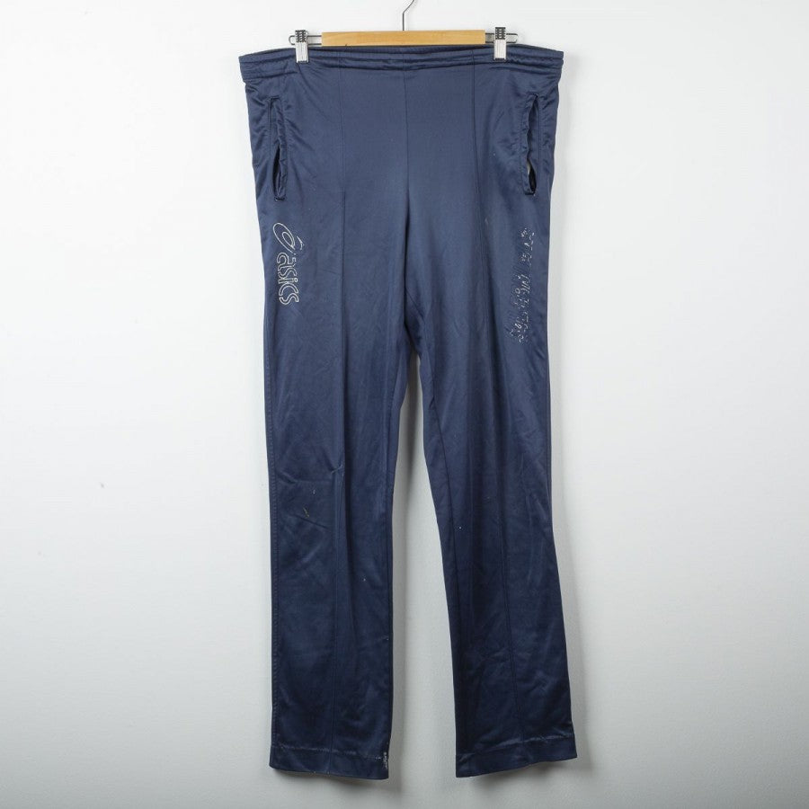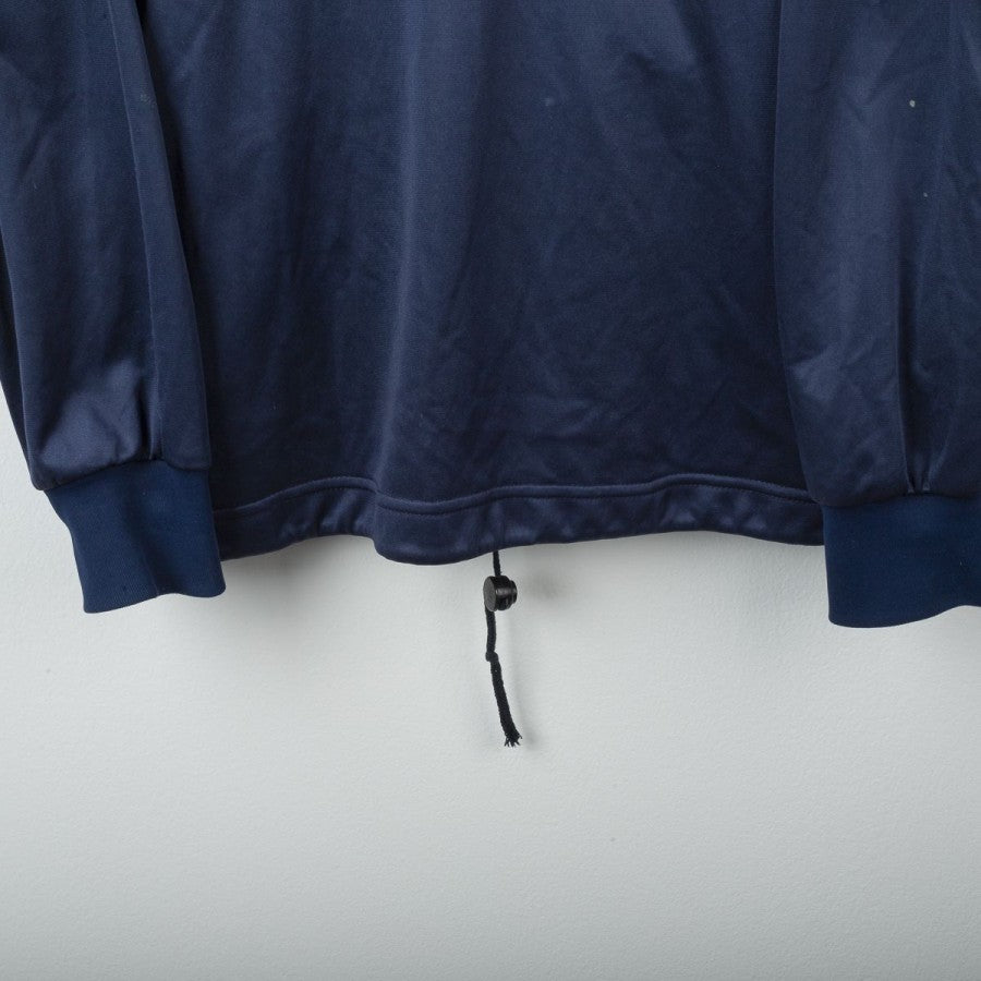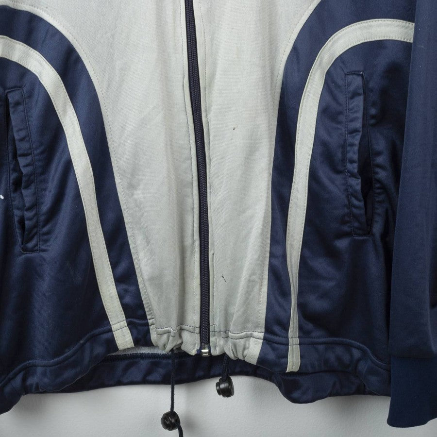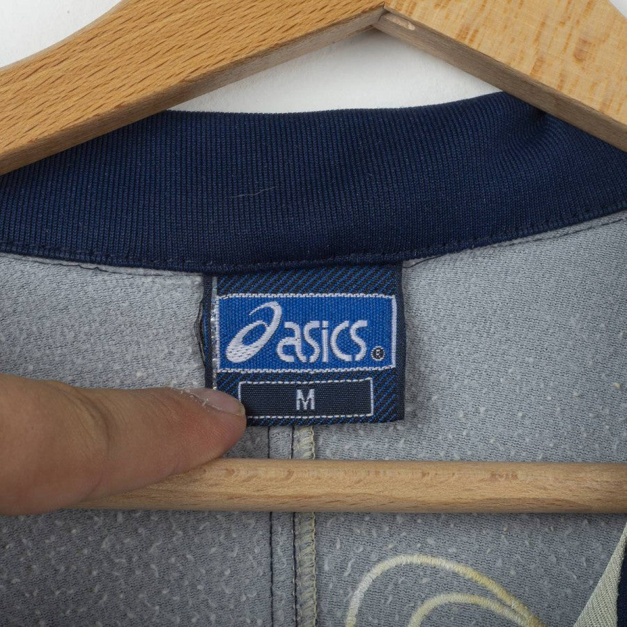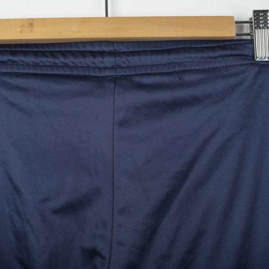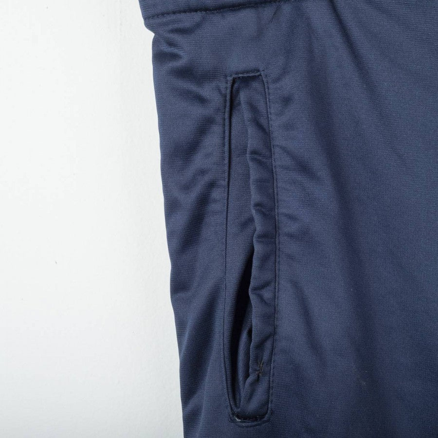 Asics Salernitana tracksuit from the 1997/1998 season. Navy blue and grey model with white details. Full-zip jacket with side pockets and adjustable drawstring waist. Embroidered U.S. Salernitana 1919 crest on the chest and Asics logo on the right side. Asics logos also featured on the sleeve and back. Matching navy blue trousers with embroidered Asics logo on the leg. Medium Size.