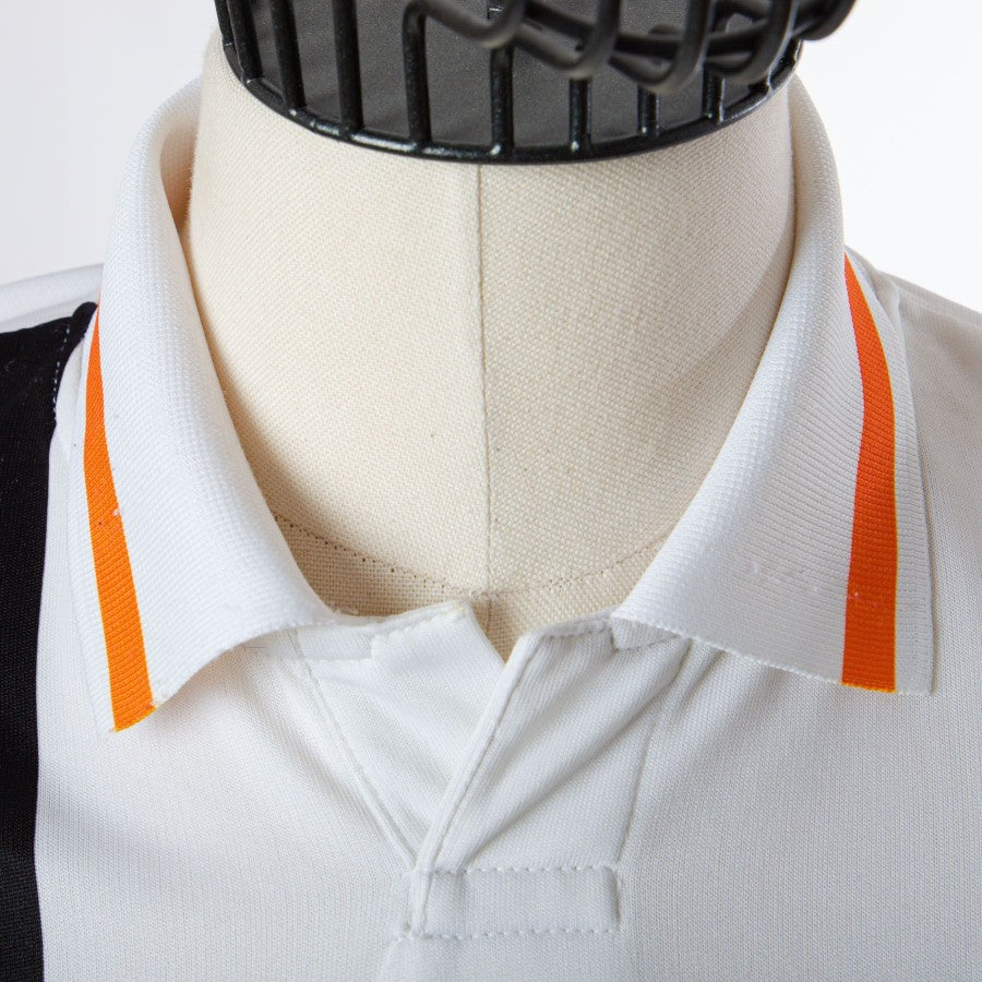 Venezia long sleeve white jersey with black, orange and green inserts. Away model for the 1992/1993 season with buttonless polo collar. Diadora and A.C. Venezia logos are embroidered on the front. At the center is flocked the logo of the commercial sponsor Giocheria while on the back is applied in orange the number 4.