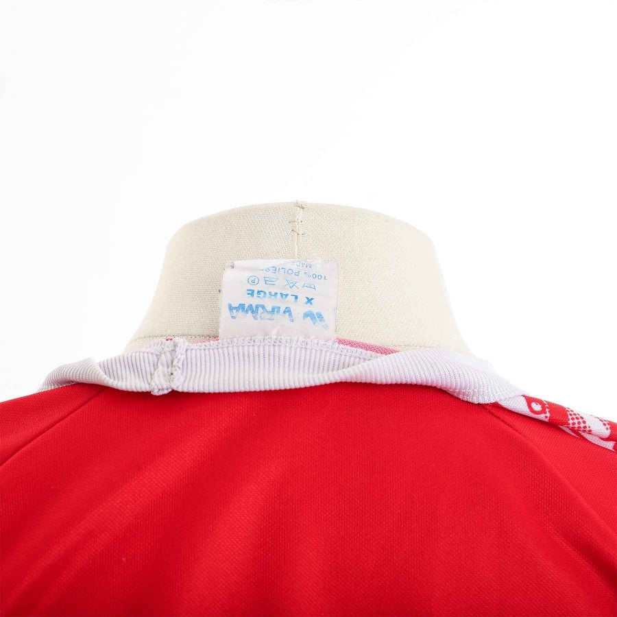 The Vicenza training shirt was made by Virma for the 1994/1995 season. It is red with a white choker. Sleeve saddle band that recalls the logo of the commercial sponsor. Main Sponsor Pal Zileri. Internal label size XL.