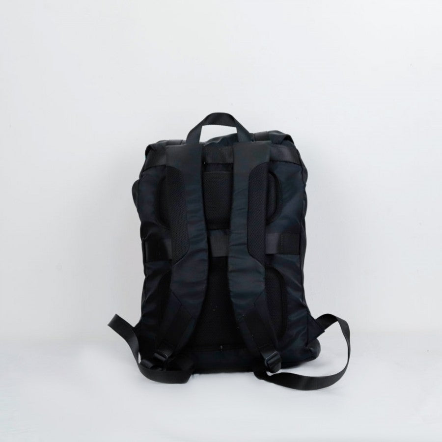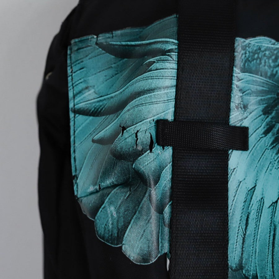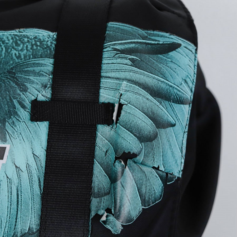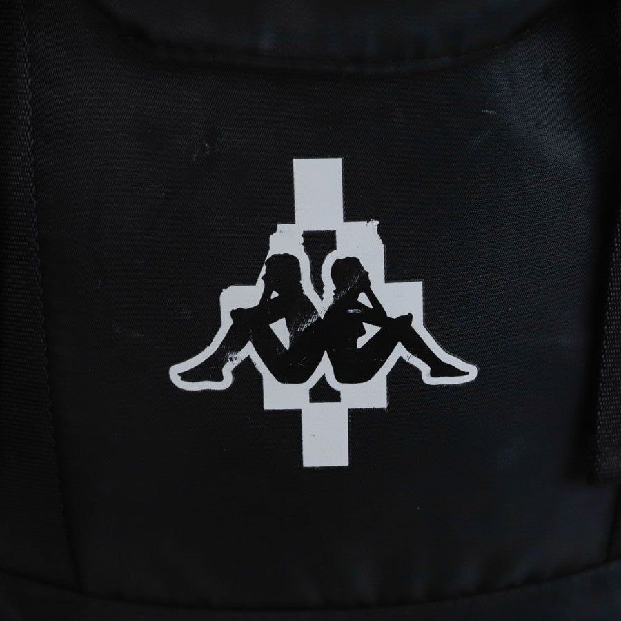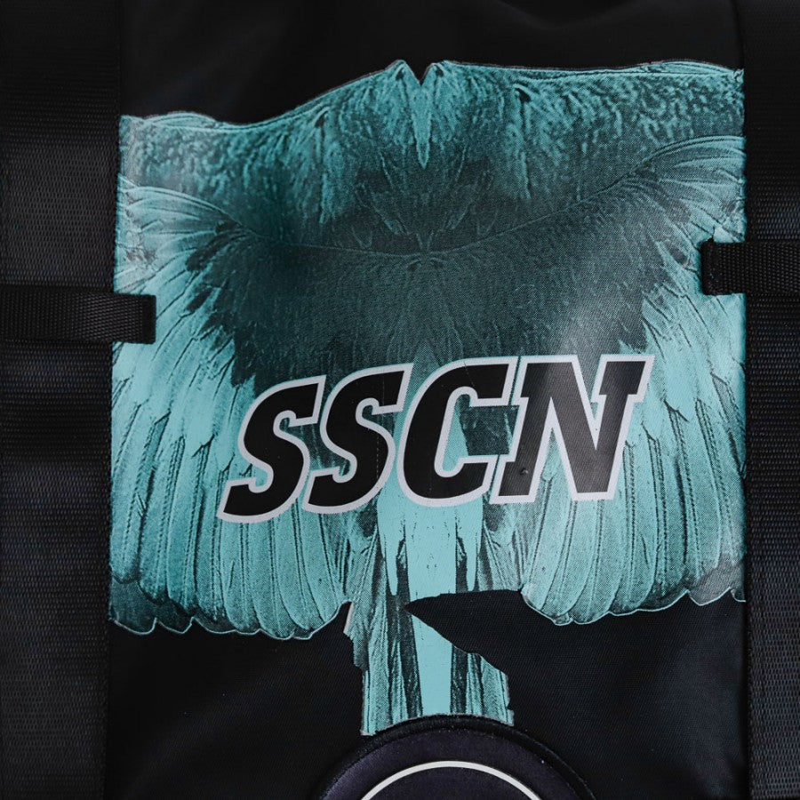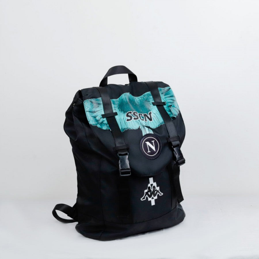 Official Napoli backpack from the 2020/2021 season, designed in collaboration with renowned designer Marcelo Burlon and produced by technical sponsor Kappa. This black backpack features a unique design with a blue wing-shaped graphic, reflecting the iconic colors of the Partenopei. The SSCN initials are embroidered on the top flap, while the Napoli logo, with the classic white "N" on a black background, is centered prominently. The Kappa logo is displayed at the bottom, highlighting the strong partnership. The backpack comes with buckle closures, adjustable straps, and ample internal space, combining practicality with fashionable appeal.