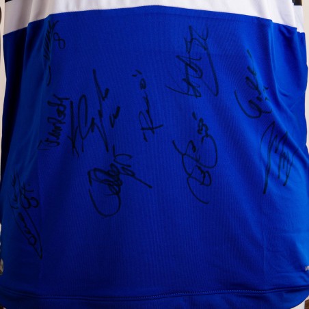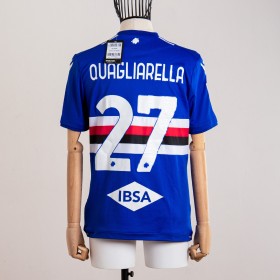 Sampdoria Home Jersey 2021/2022. Official product Macron in the traditional colors blue, white and red. Applied team logo on heart side. Macron and sponsor commercial logos printed in white. On the front are the autographs of the players written in pen. On the right sleeve there is the patch Serie A Tim. On the back in blue are printed lettering QUAGLIARELLA and number 27.