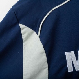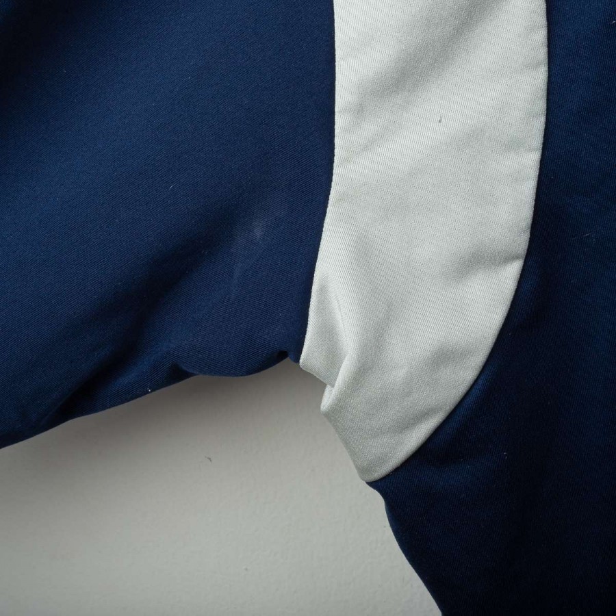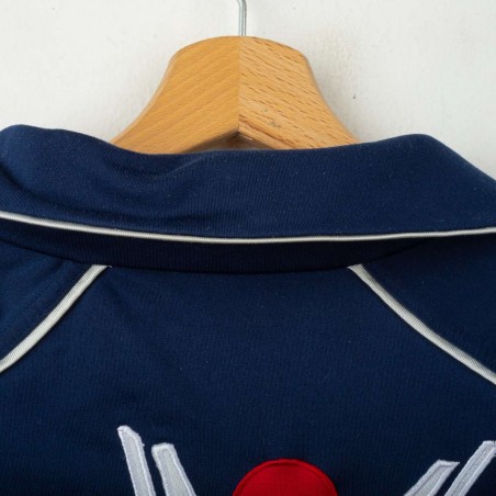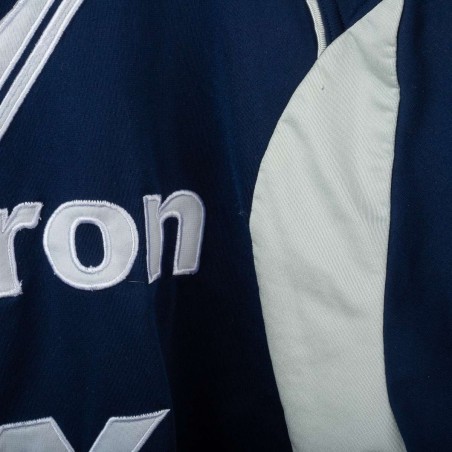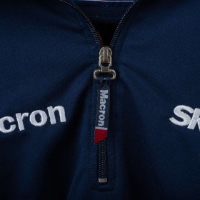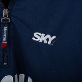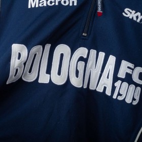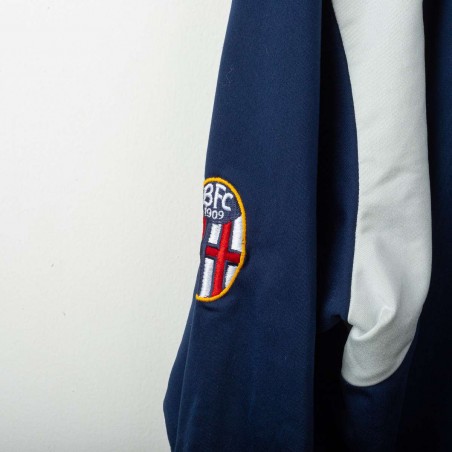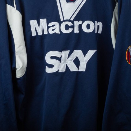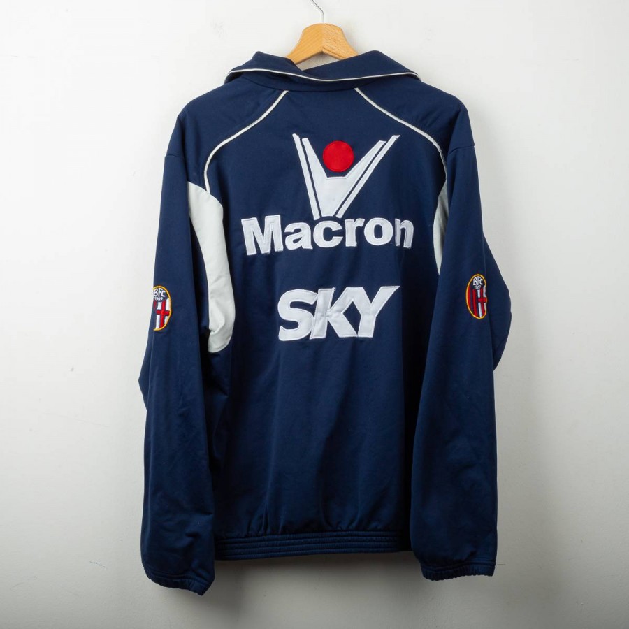 Bologna FC 1909 training sweatshirt from the 2001/2002 season, made by Macron. Navy blue with white details and front zipper. Macron logos embroidered on chest, back, and collar. SKY sponsor and "Bologna FC 1909" raised lettering on the front. Bologna crest patches stitched on both sleeves. Comfortable fit, size XL. Official vintage training model.