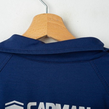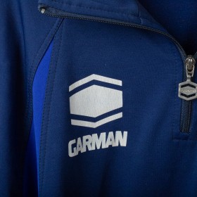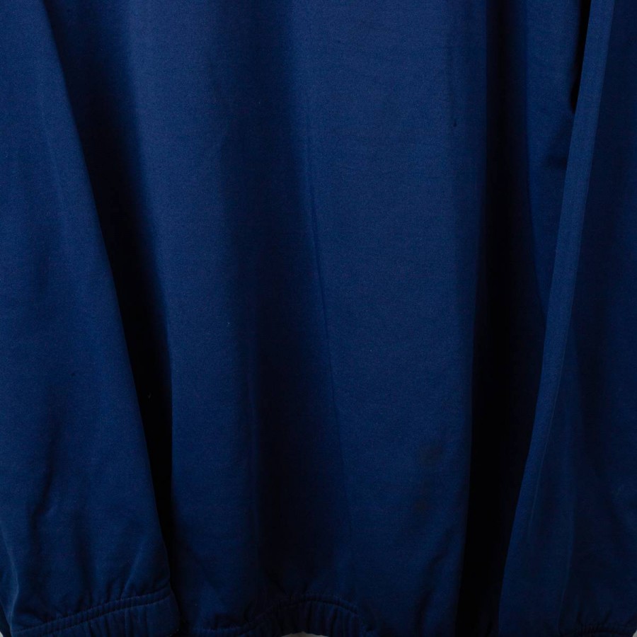 Brescia Calcio sweatshirt from the 2001/2002 season, made by Garman. Blue with lighter side inserts. White printed Garman logo on right chest and back. Embroidered Brescia Calcio badge on left chest. “Banca Lombarda” sponsor printed in white on the front, “Banco di Brescia” printed on the back. Half zip front with Garman-branded puller, elastic cuffs and hem. Size XXL.