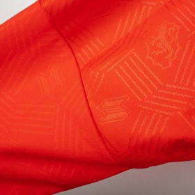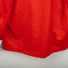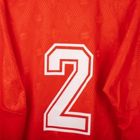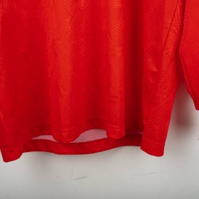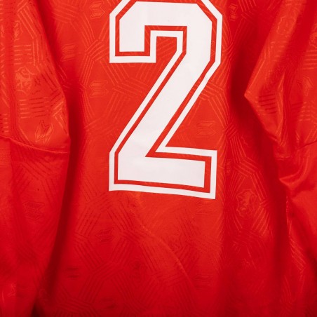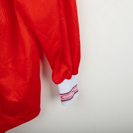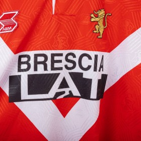 Brescia Calcio away shirt from the 1996/1997 season, made by ABM. Long sleeve version in red with a white V-shaped chest band and black sponsor details. Embroidered ABM logo on the right chest, stitched golden lion crest on the left chest. Printed Brescialat sponsor on the front. White polo collar with buttons and red graphic details. Lightweight technical jacquard fabric featuring ABM and lion patterns. On the back, number 2 in white print. Size XL.