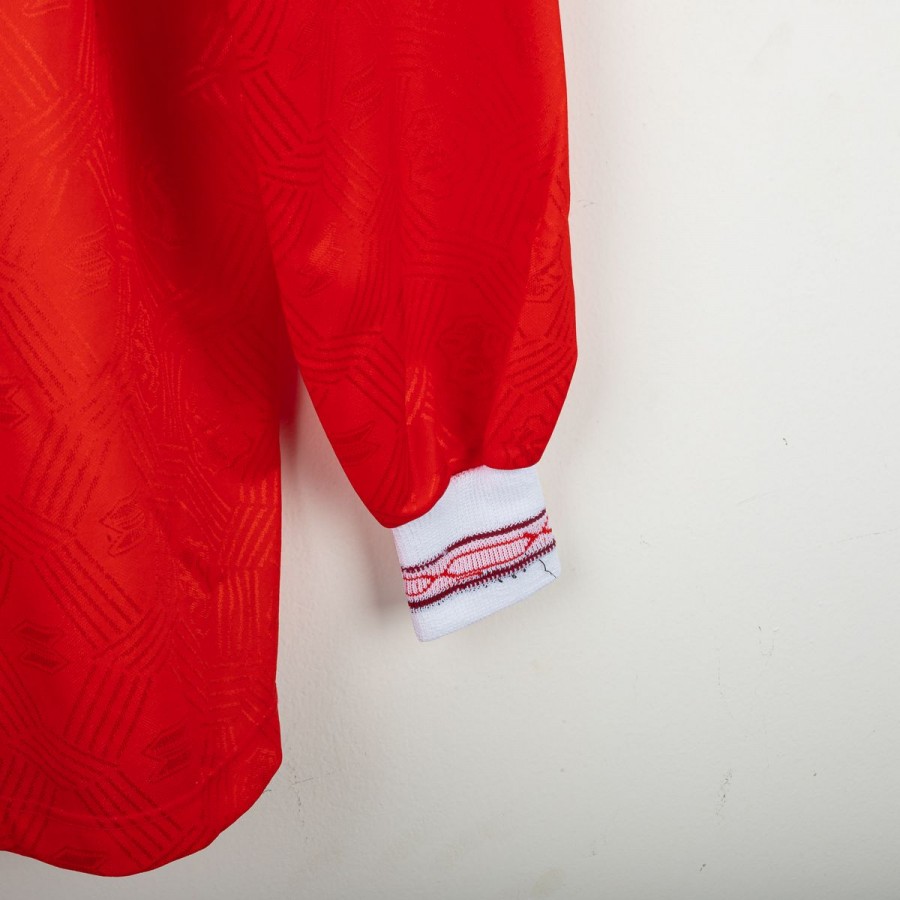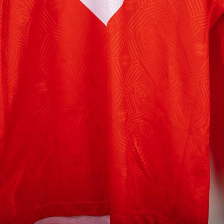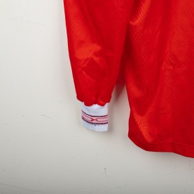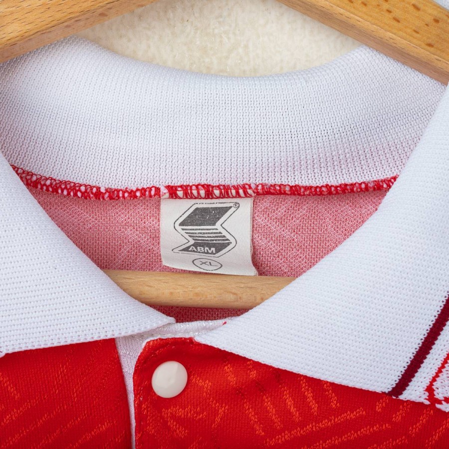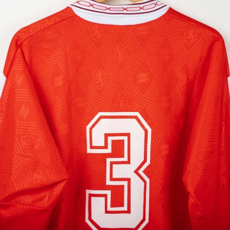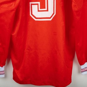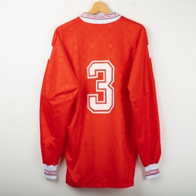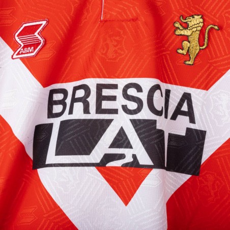 Brescia away shirt from the 1996/1997 season, made by ABM. Long sleeve version in bright red with a large white V across the chest and white details on collar and cuffs. Embroidered ABM logo on the right chest, stitched golden lion crest on the left chest. Printed Brescia Lat sponsor in black across the front. Official number 3 applied on the back. Made of lightweight breathable technical fabric. Size XL.
