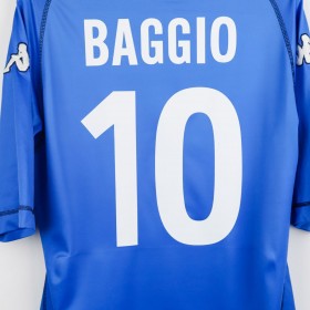 Official Brescia home shirt from the 2003/2004 season, produced by Kappa and personalized with the name and number 10 of Roberto Baggio. The design features the iconic light blue color with the traditional white "V" on the chest. The Banco di Brescia sponsor is printed in the center, with Kappa logos embroidered on both sides of the chest and on the sleeves. The Brescia Calcio crest is applied on the left side. On the back, “Baggio” and number 10 are printed in white. Made from polyester and elastane, the shirt is in size L, ensuring a comfortable fit.