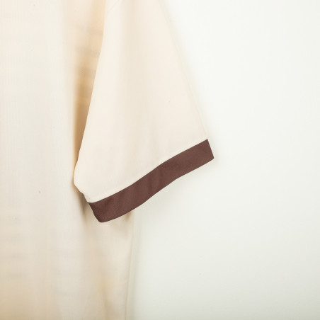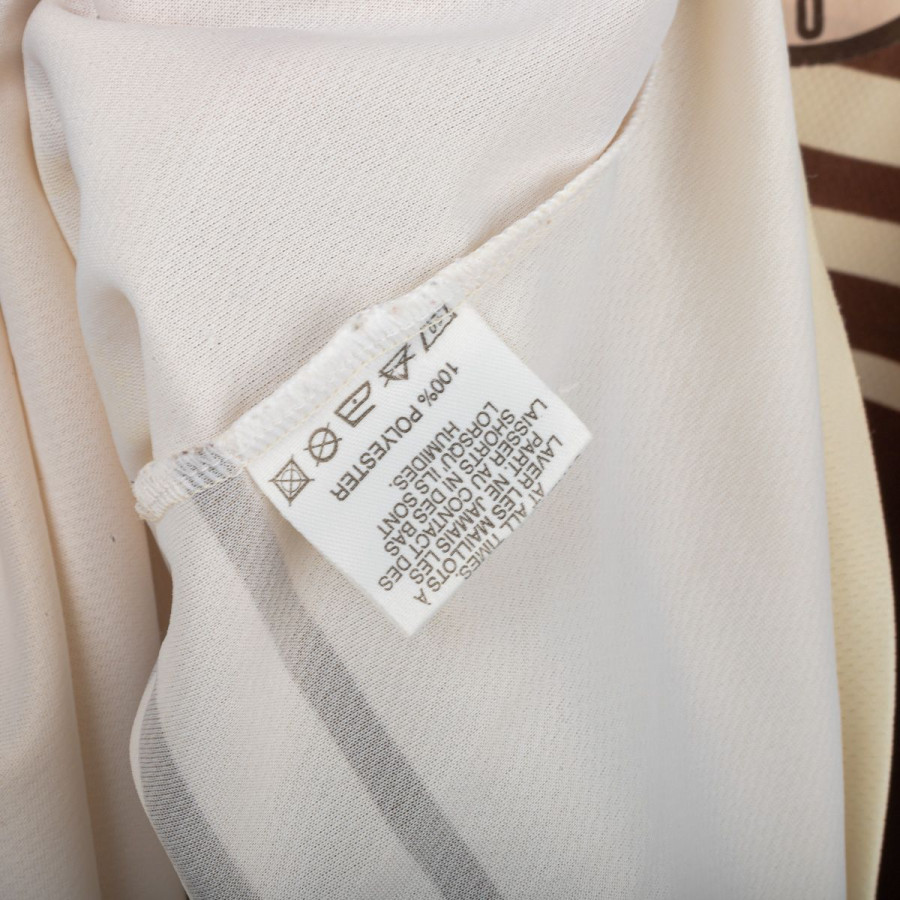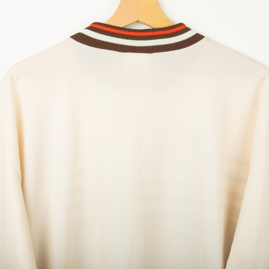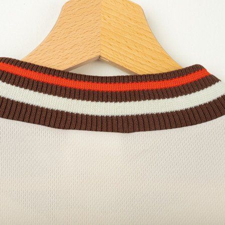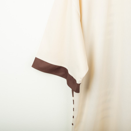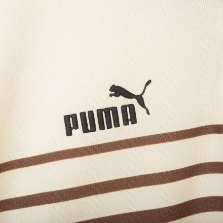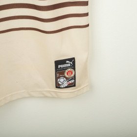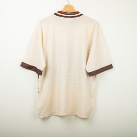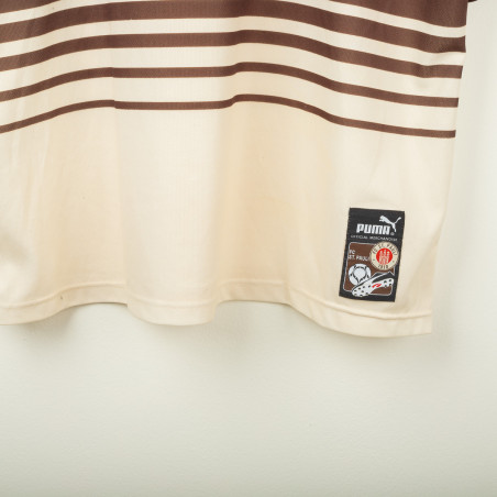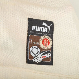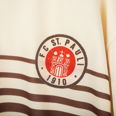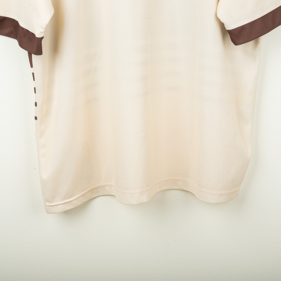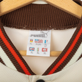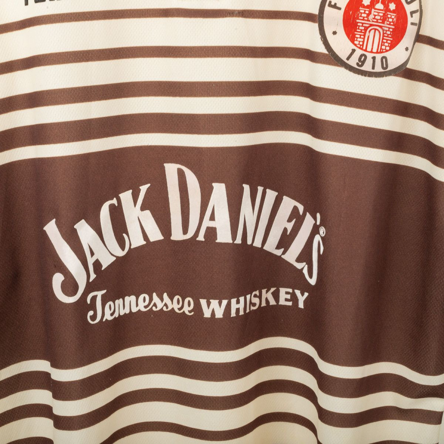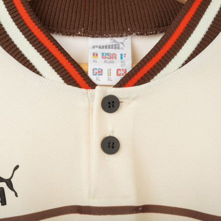 St. Pauli home shirt from the 1997/1998 season, made by Puma. Beige base with brown inserts and horizontal stripes across the chest. Embroidered Puma logo on the right and printed FC St. Pauli 1910 crest on the left chest. Jack Daniel’s sponsor printed in the center. Ribbed collar with two-button closure and team-color detailing. Official Puma label stitched at the hem. 100% polyester, regular fit. Size XL.