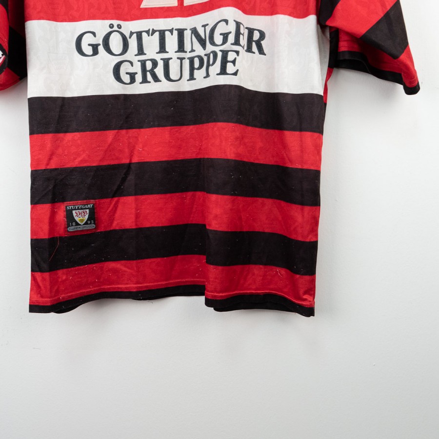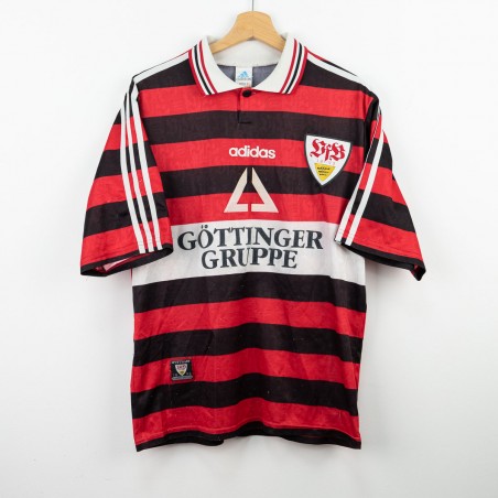 Stuttgart's away jersey for the 1997/1998 season. The club crest is stitched, the Adidas logo is embroidered, and the commercial sponsor is applied in flock. Size M.