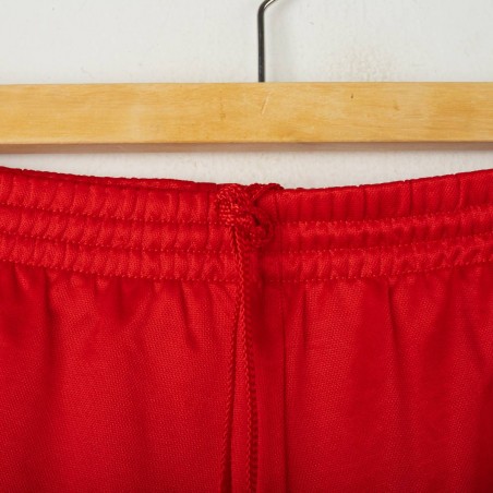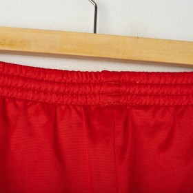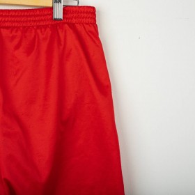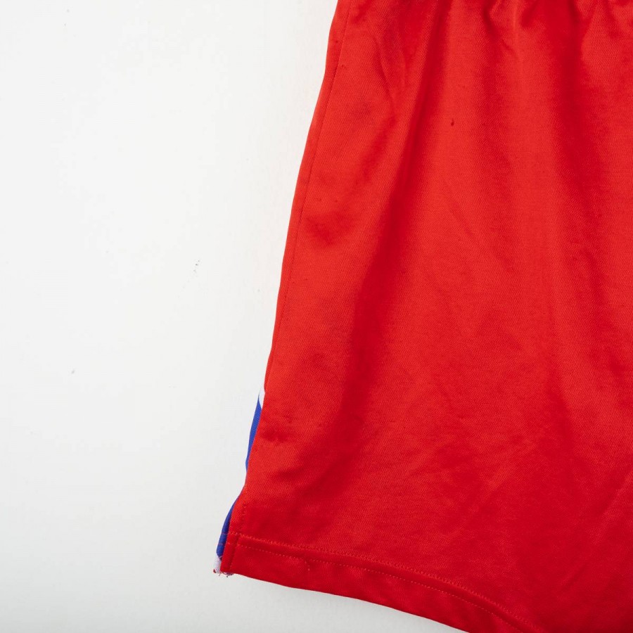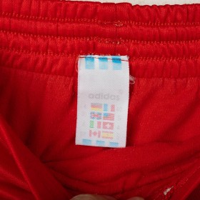 Bayern Munich home shorts from the 1992/1993 season, made by Adidas. Bright red design featuring bold blue diagonal Adidas Equipment stripes on the right leg with white trim. Embroidered Bayern Munich crest on the left leg and printed Adidas Equipment logo. Red drawstring waist. Size S.