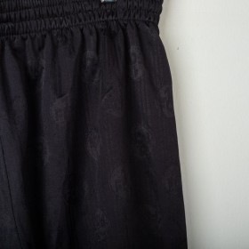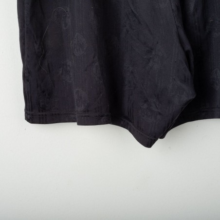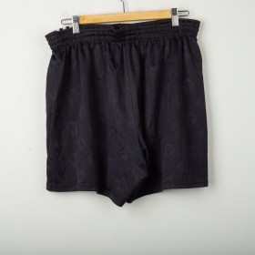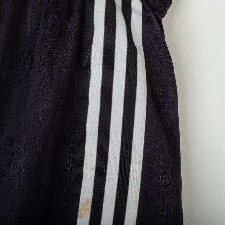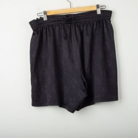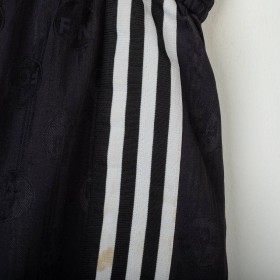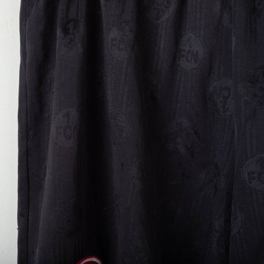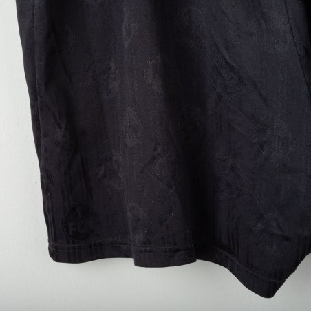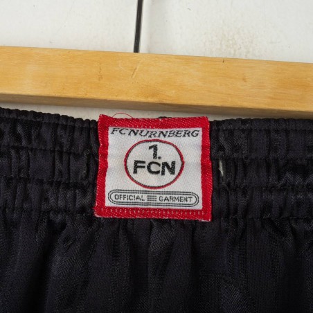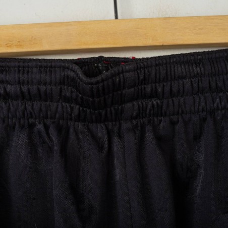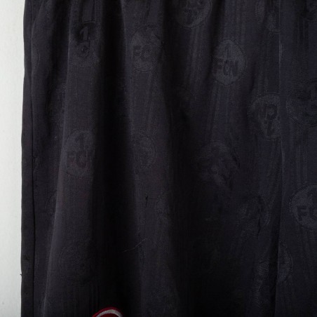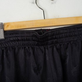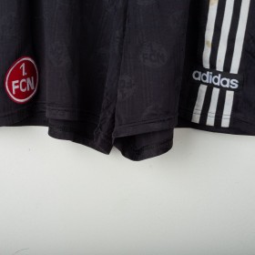 FC Kaiserslautern home shorts from the 1996/1997 season, made by Adidas. Red shiny fabric with tone-on-tone FCK pattern. Embroidered Adidas logo and white stripes on sides. Embroidered club badge on left leg. Elastic waistband with inner drawstring. Size L.