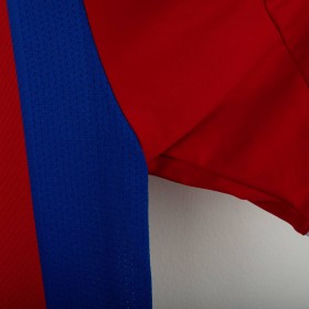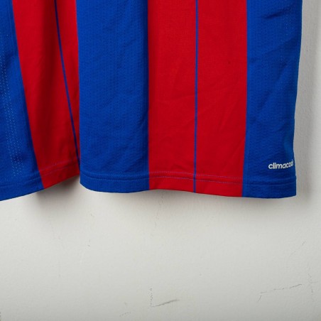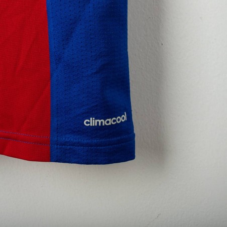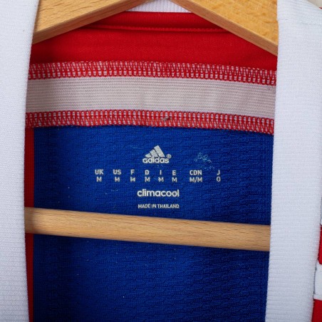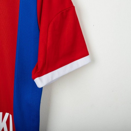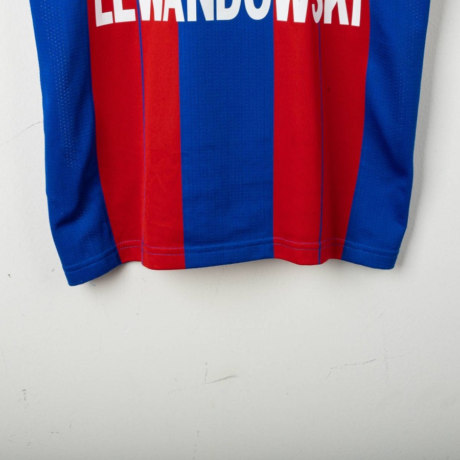 Bayern Munich home shirt from the 2014/2015 season, made by Adidas. Red and blue vertical stripes with white collar and sleeve trim. T-Mobile sponsor and Adidas logo applied. Bayern crest with four stars applied on the chest. "Lewandowski" and number 9 printed on the back in official Bundesliga style. Regular fit, size M.