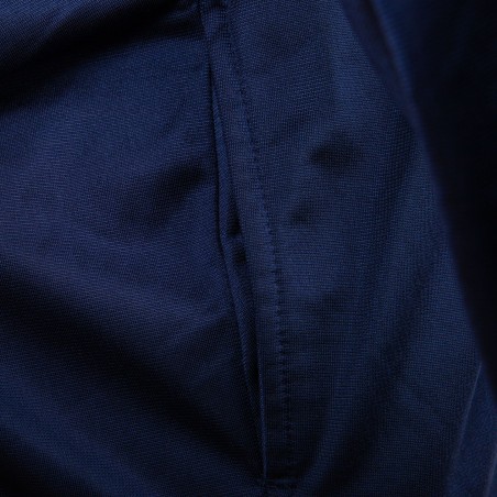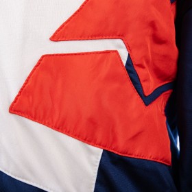 Presentation suit in acetate material, in white, red and blue with contrasting color fabric inserts that draw a geometric pattern. The Umbro logo is embroidered on the right side, while the coat of arms of the four Moors is serigraphed on the heart side.