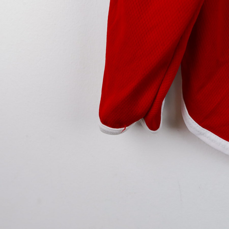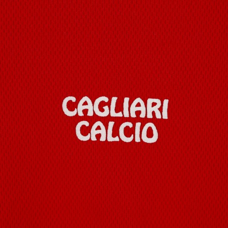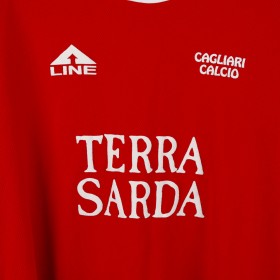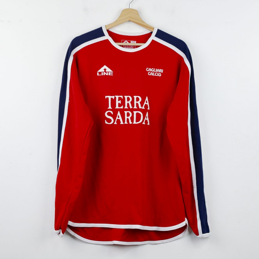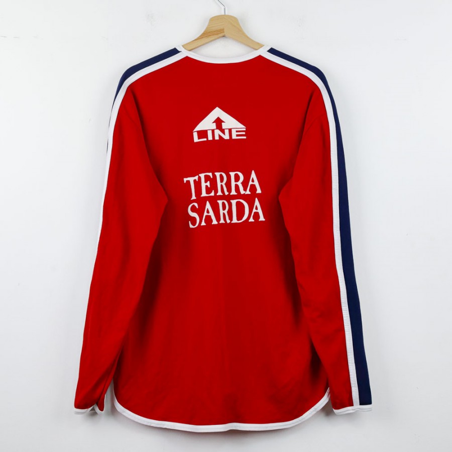 Official training jersey of Cagliari Calcio from the 2003/2004 season, produced by technical sponsor A-Line. The jersey features a clean and elegant design with a red base, blue detailing along the sleeves, and white trims. The A-Line logo is displayed on the chest next to the "Cagliari Calcio" text, with the commercial sponsor "Terra Sarda" prominently in white at the center. On the back, the A-Line logo and sponsor are repeated. Made of 100% polyester, this jersey is an exclusive piece from the season that marked the team’s promotion to Serie A.