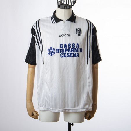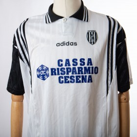 contrast, polo-style closure with button. Model short-sleeved competition shirt with intact piping. On the front side, the heart of the AC Cesena crest is sewn on and in the centre, just below the collar, there is embroidered lettering from Adidas, the technical sponsor. In the middle, the logo and lettering painted main sponsor CASSA RISPARMIO CESENA. On the back, the number 3 is applied in light plastic. XL size inner label.