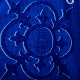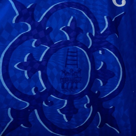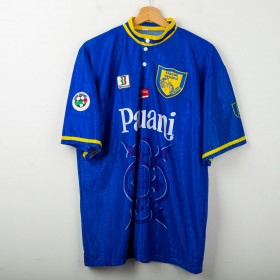 Chievo Verona Away shirt from the 1998/1999 season, made by Biemme. Blue color with yellow details on collar and sleeve edges. Stitched Chievo crest on the chest, embroidered Biemme logo on the right, and printed Paluani sponsor at the center. Lega Calcio patch stitched on the right sleeve and Verona’s ladder symbol on the left. On the back, white Corini 10 personalization. Polo-style collar with buttons. Made of lightweight breathable technical fabric. Historic shirt, worn in Serie B season.
