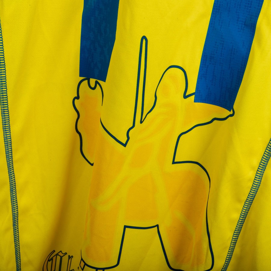 The uniform has short sleeves in yellow and blue. Coat of arms on the left and Lotto logo embroidered in the center. Below is the commercial sponsor Ferroli. Serie A patch on the right sleeve.