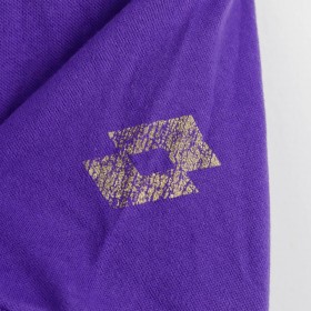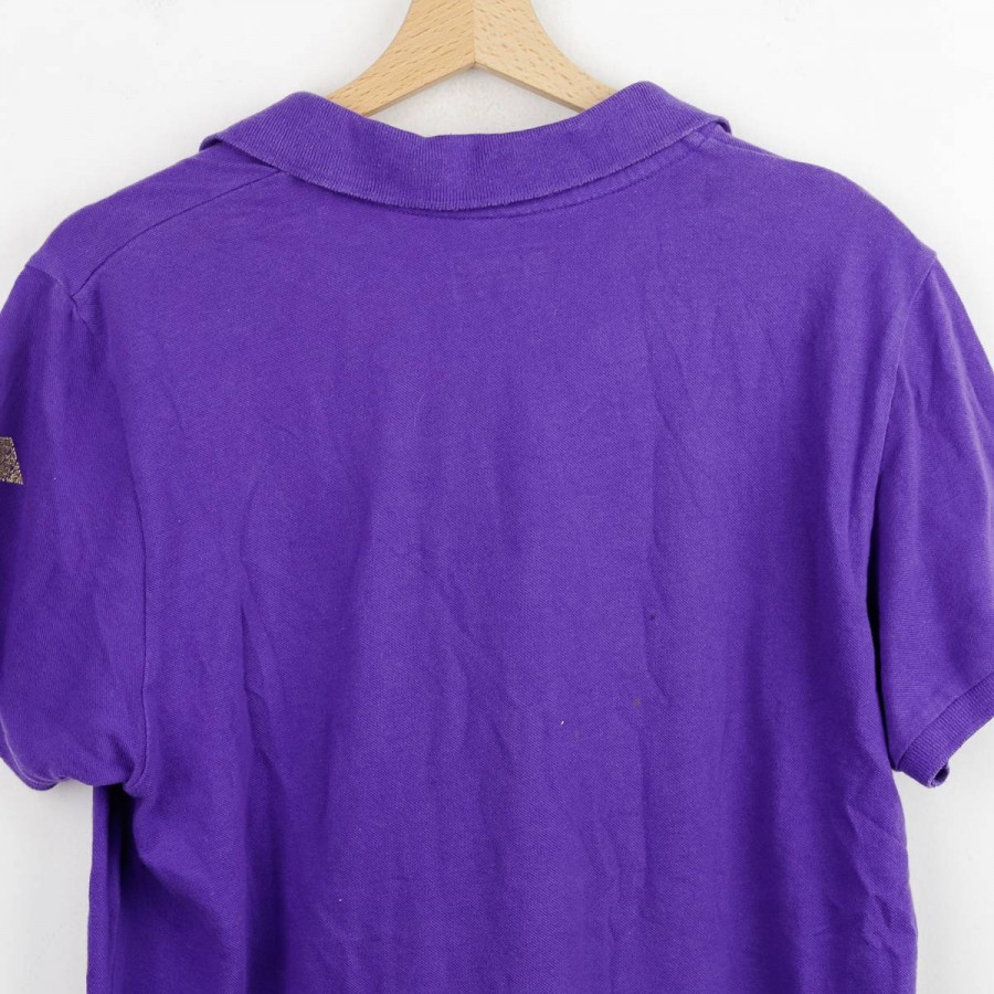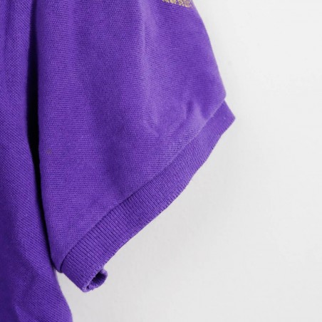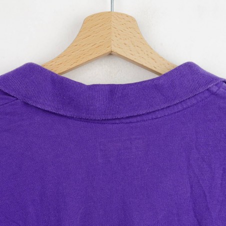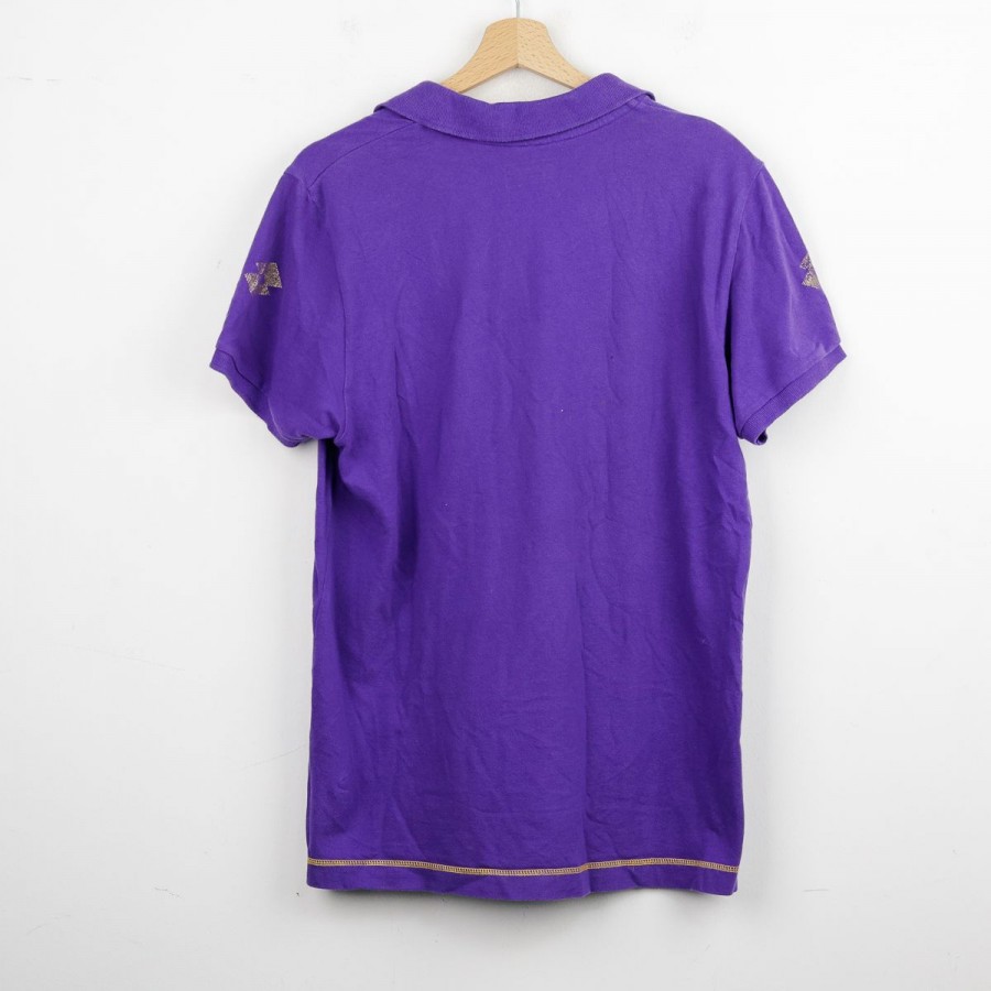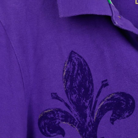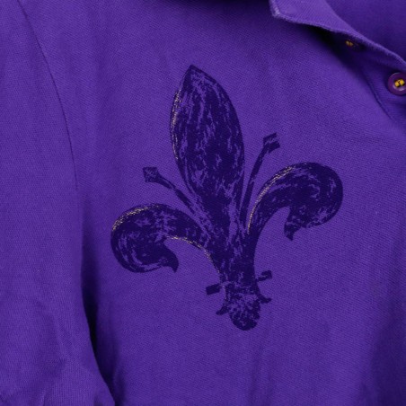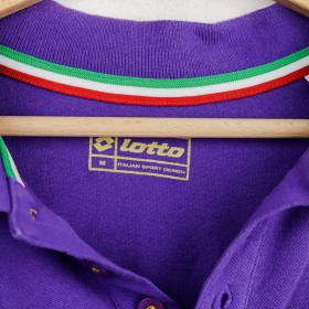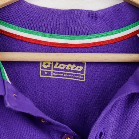 Official Fiorentina polo shirt from the 2008/2009 season made by technical sponsor Lotto. The shirt is purple, featuring a tone-on-tone lily emblem on the left chest, club badge stitched on the heart side, and the Fiorentina name with TOYOTA sponsor on the right. A tricolor detail decorates the collar, evoking Italian pride. Lotto branding appears on both sleeves and the right shoulder. Size marked as M.