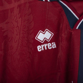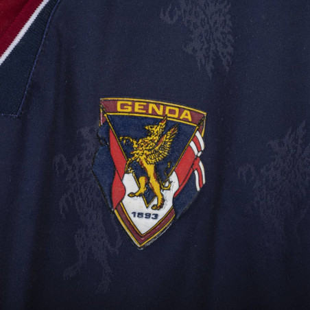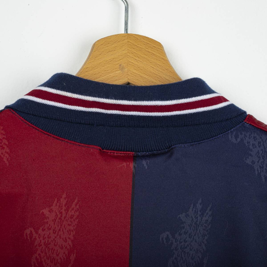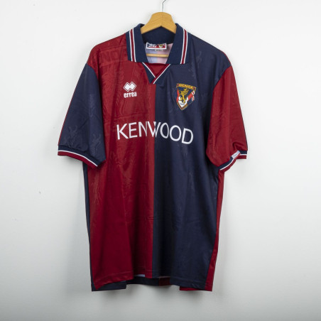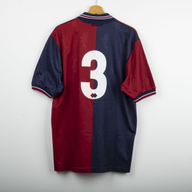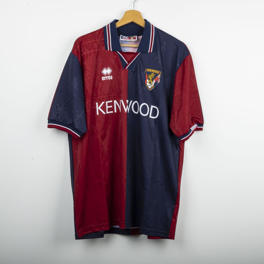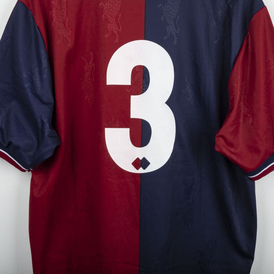 Genoa home shirt from the 1994/1995 season, made by Erreà. Classic half red and blue design with griffin jacquard details. Erreà logo on the right chest, Genoa crest embroidered on the left chest. Kenwood sponsor printed across the front. Polo collar with red and white trim. Number 3 printed in white on the back. Size XL.