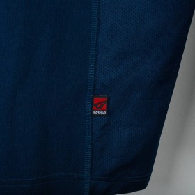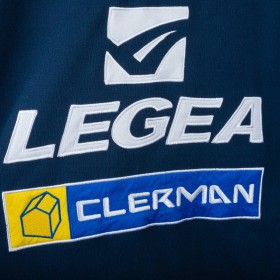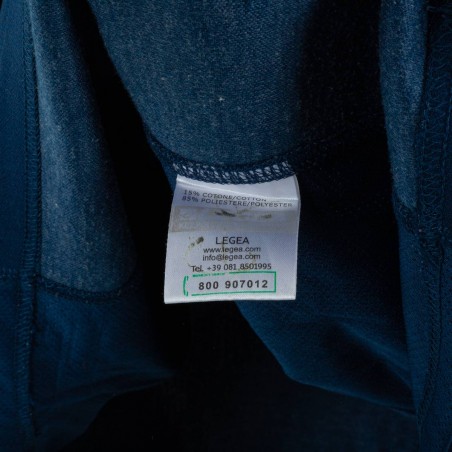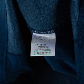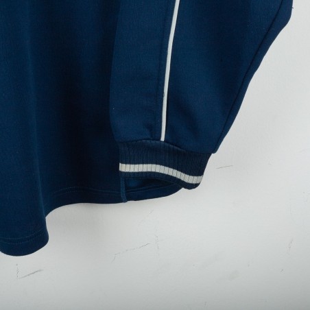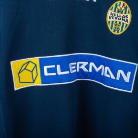 Hellas Verona training sweatshirt from the 2006/2007 season, made by Legea. Navy blue with white inserts and trims. Embroidered Legea logo on the right chest and large sponsor logos on the front and back. Embroidered Hellas Verona crest on the left chest. Ribbed crew neck with grey trim and elastic cuffs. Comfortable fit. Size L.