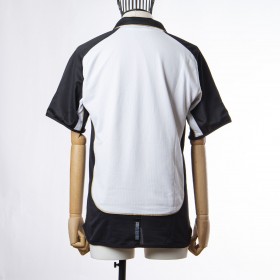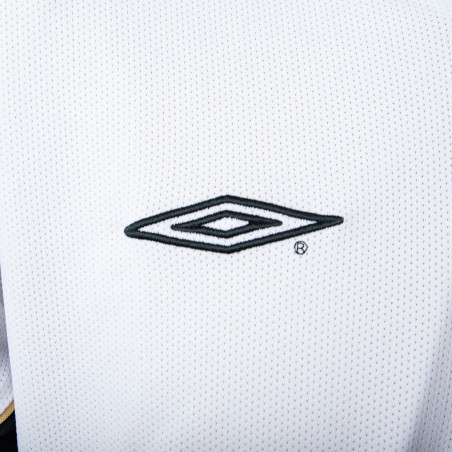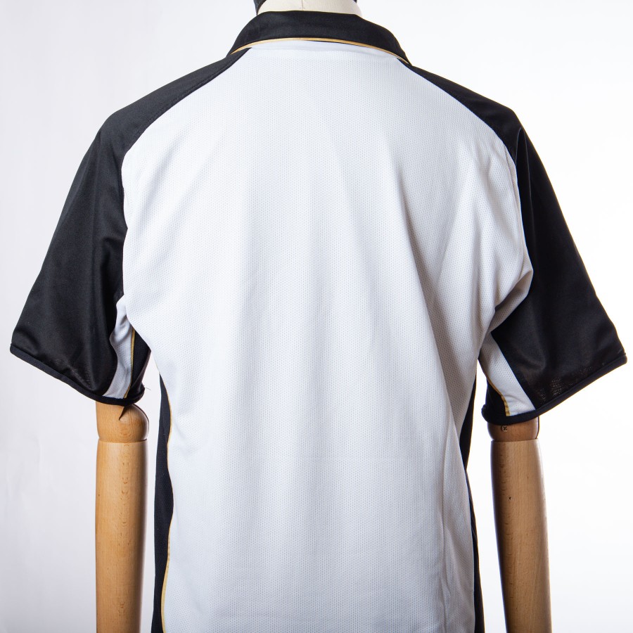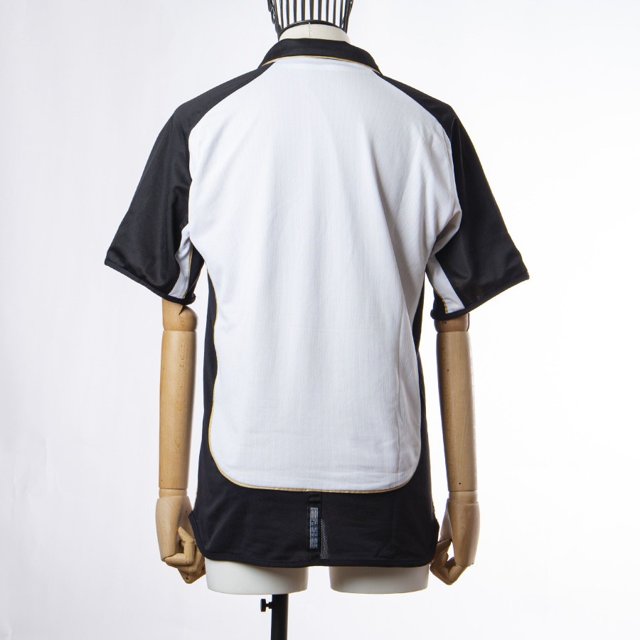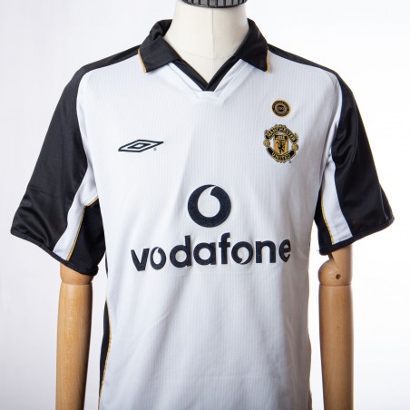 The Manchester United jersey, made for the club's centenary, has the peculiarity of being duble face, on one side white with black details and on the other side gold and black. On the white side the applications are embroidered, while on the gold side they are applied in light plastic. The commercial sponsor is Vodafone.
