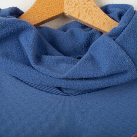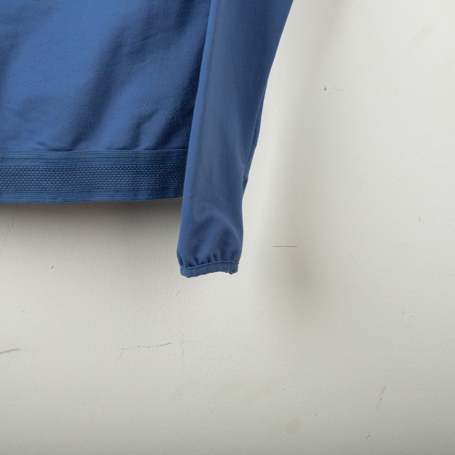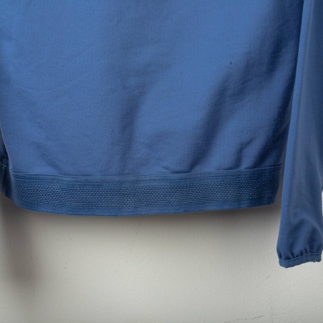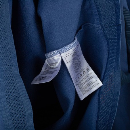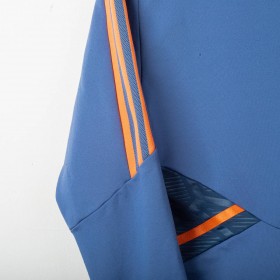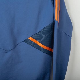 2022/2023 Manchester United Training Sweatshirt by Adidas, crafted with Cold.RDY technology to ensure warmth during cold sessions. The intense blue color is complemented by bright orange accents, including Adidas' iconic three stripes on the sleeves and the club crest on the chest. Adidas technical sponsor featured on the front. Size shown is XS. This product is part of Adidas' sustainable line, made with ocean plastic Parley.