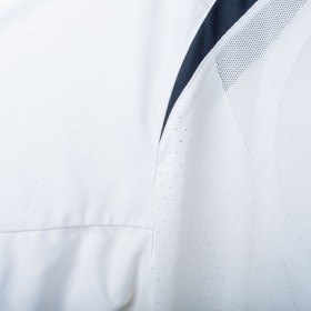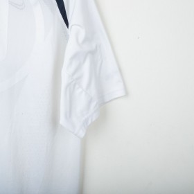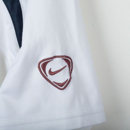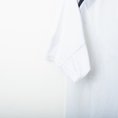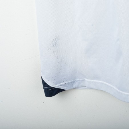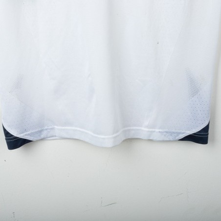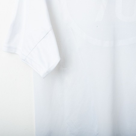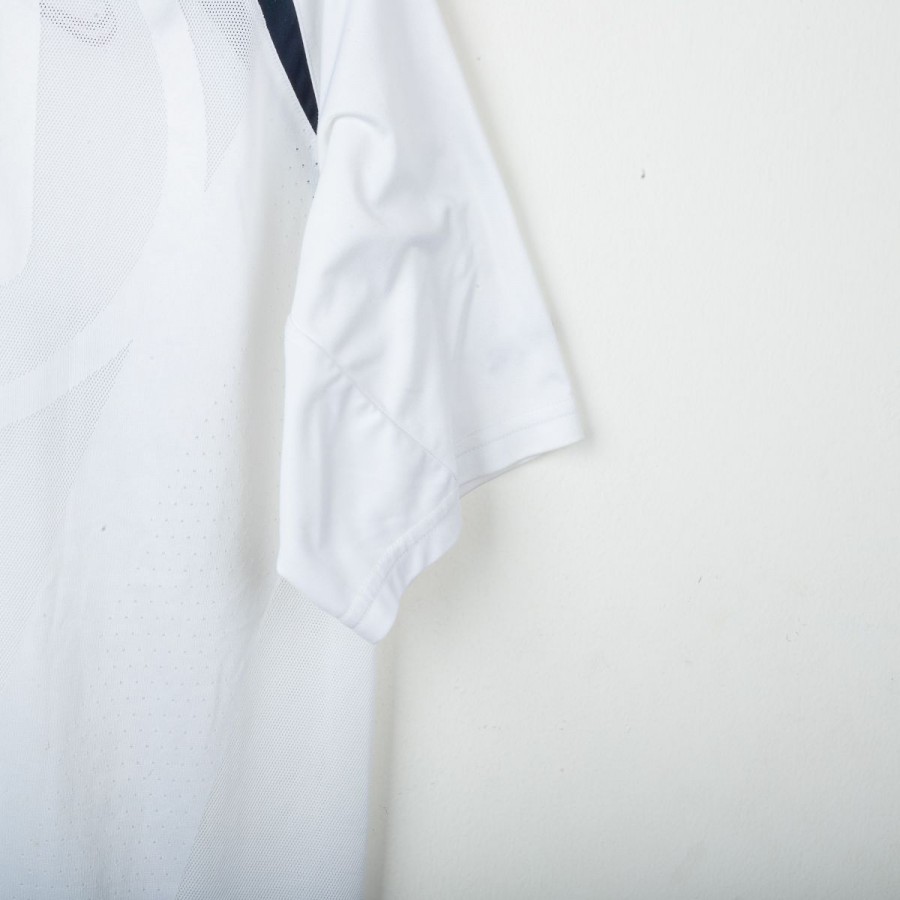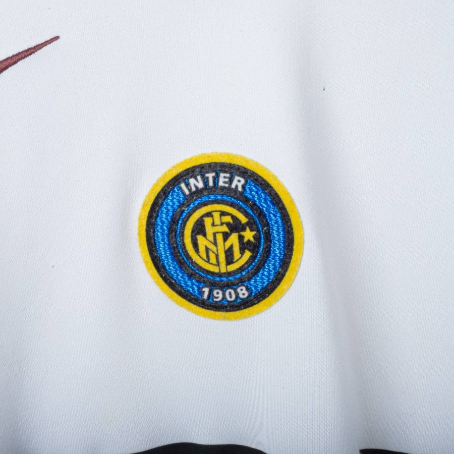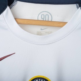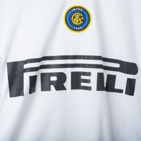 Inter Milan training shirt made by Nike for the 2005/2006 season. Short-sleeve model in white with navy inserts on shoulders and sides. Red embroidered Nike logo on right chest and embroidered Inter 1908 crest in the center. Black rubber print Pirelli sponsor on the front. Large tonal “90” print on the back. “INTER” embroidery in red on the left sleeve and Nike 90 logo embroidery on the right sleeve. Reinforced crew neck collar. Regular fit.