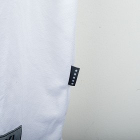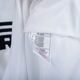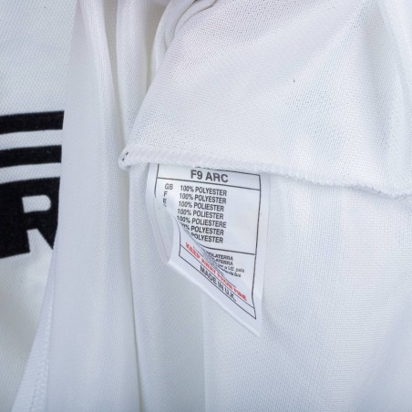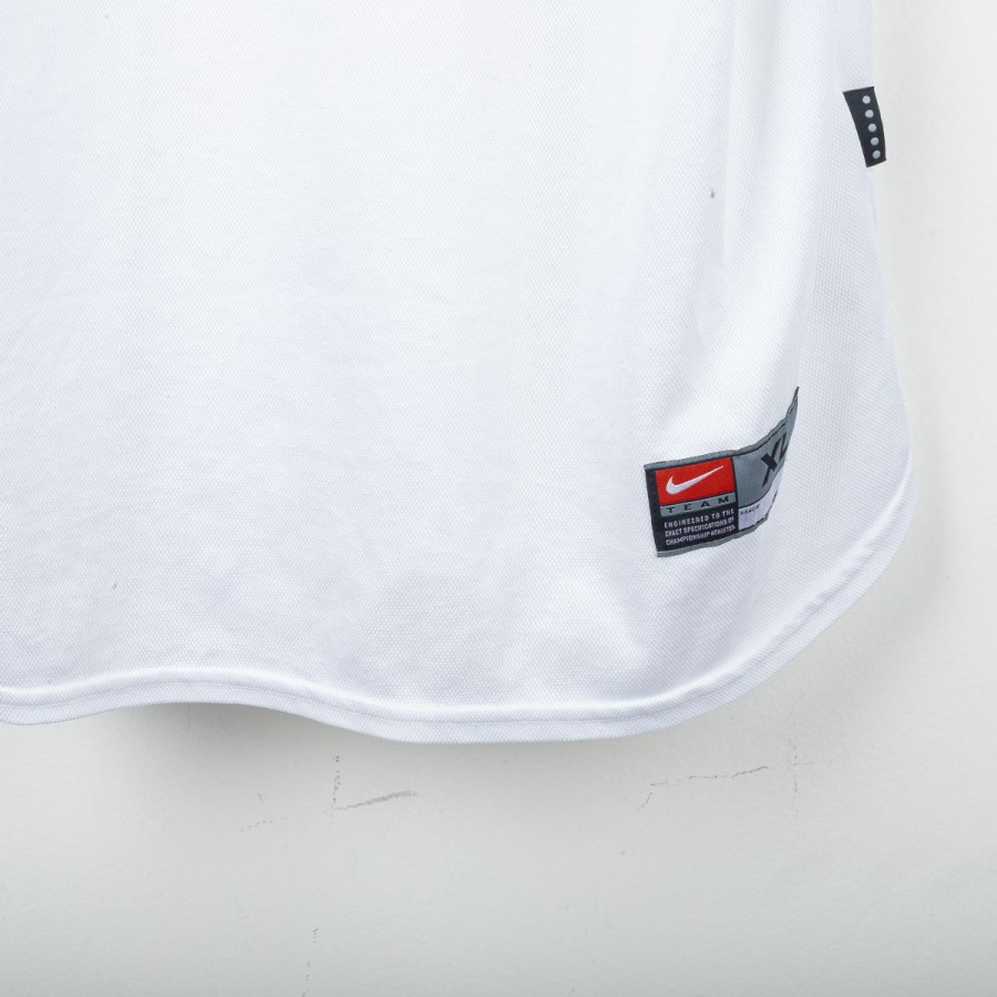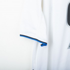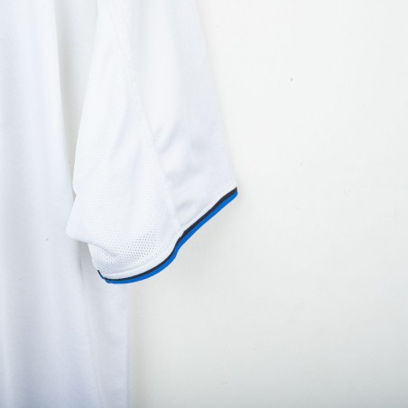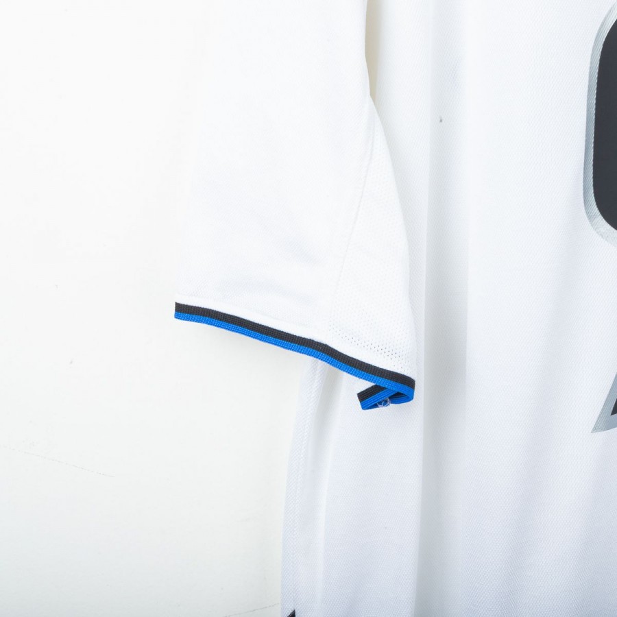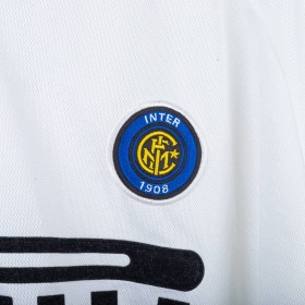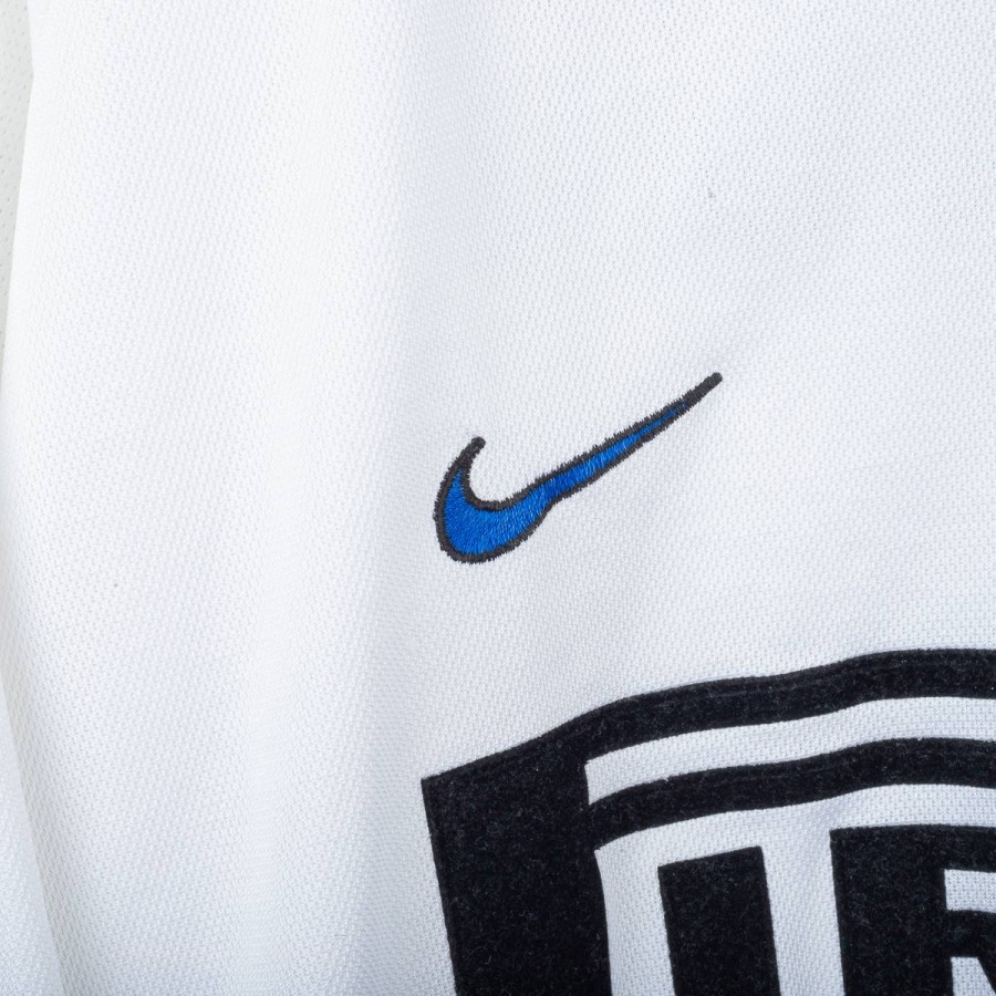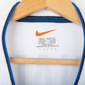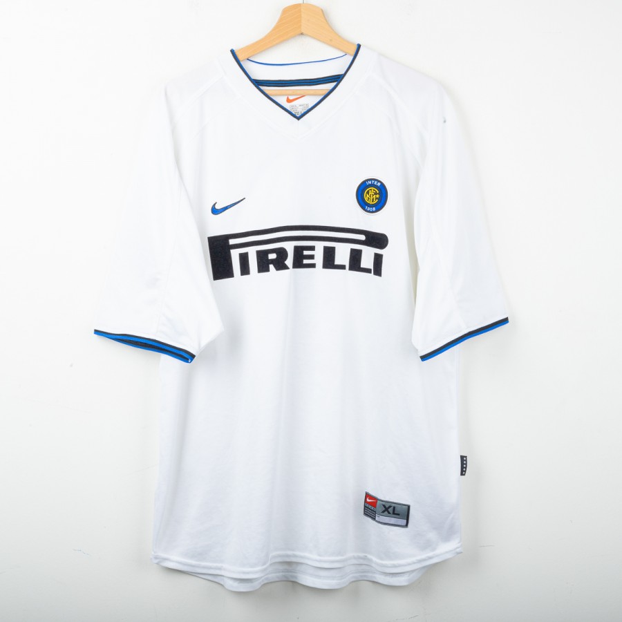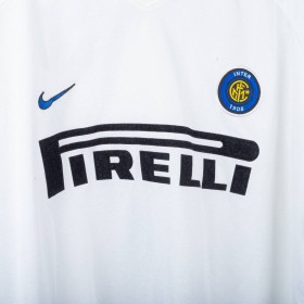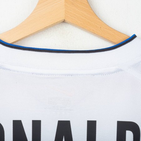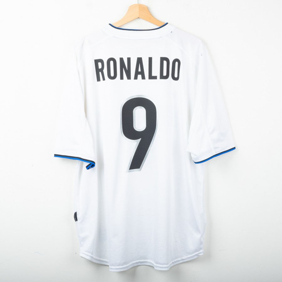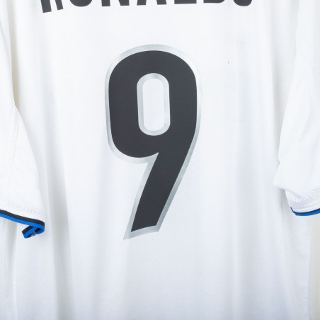 Inter Milan away shirt from the 1999/2000 season, made by Nike. White with black and blue details on collar and sleeves. Embroidered blue and black Nike logo on the right chest, embroidered Inter crest on the left. Black flock Pirelli sponsor at the centre. Name "Ronaldo" and number 9 printed on the back in black with silver outline. Loose fit typical of the era. Size XL.