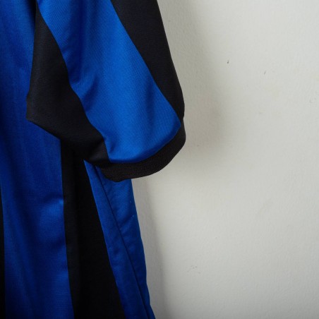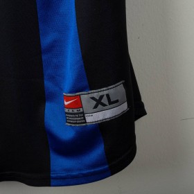 Inter 1999/2000 home shirt by Nike, featuring Ronaldo name and number 9. Classic black and blue stripes with Nike logo and Inter crest. Pirelli sponsor. Short sleeve model with crew neck. Visible size tag XXL.